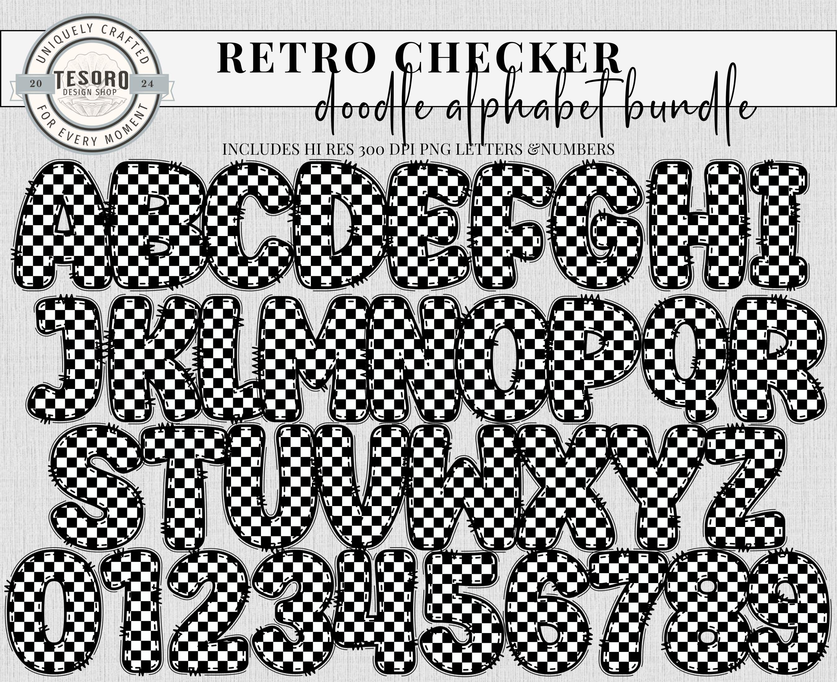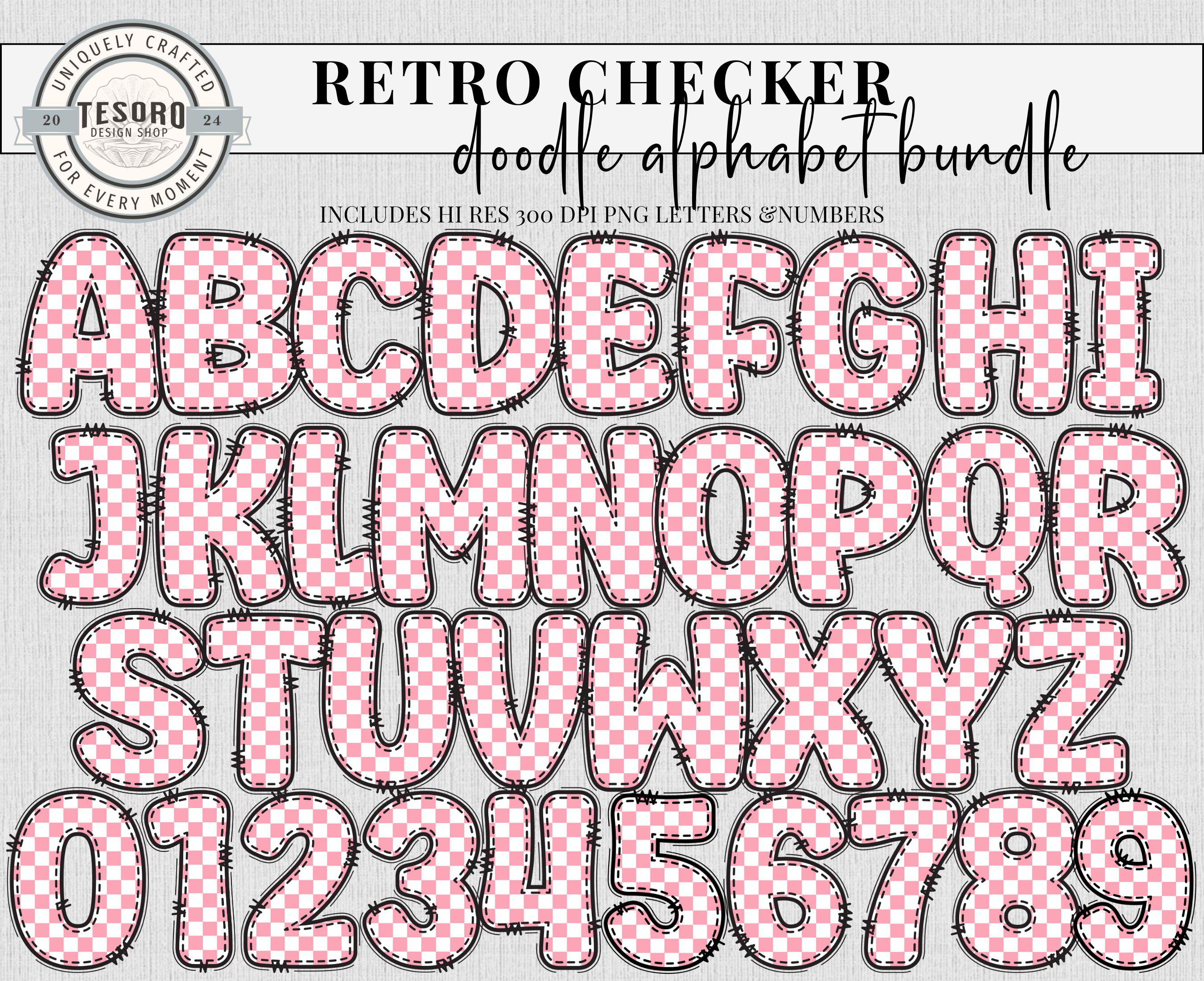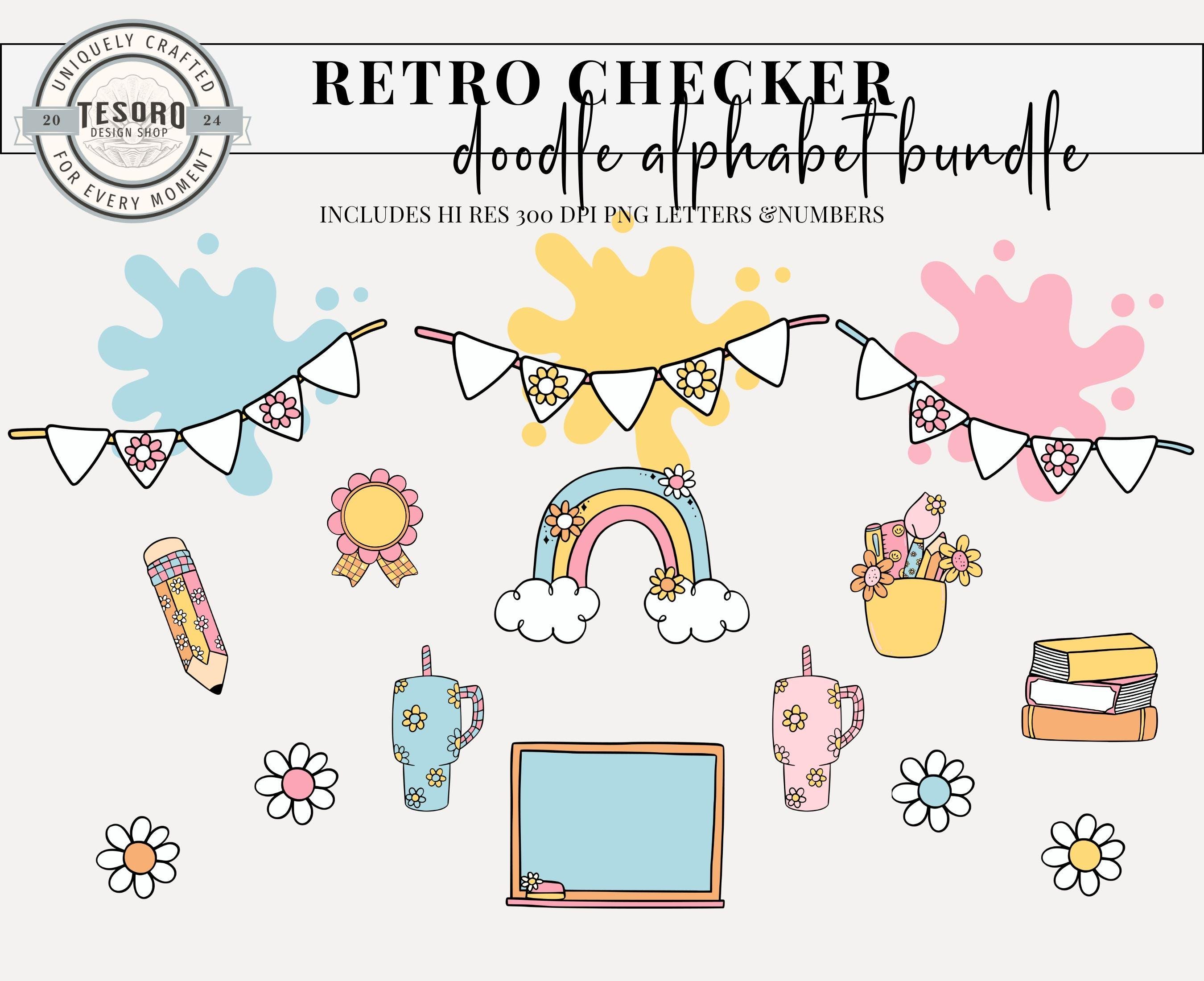 School Classroom Decor Printable | Cute Trendy Alpha A-Z Set |Doodle Alphabet | Alphabet Bundle Doodle PNG | Pink Checker Black Checker Retro Letters School Teacher Bulletin Board Clipart | Instant Download | Sublimination File