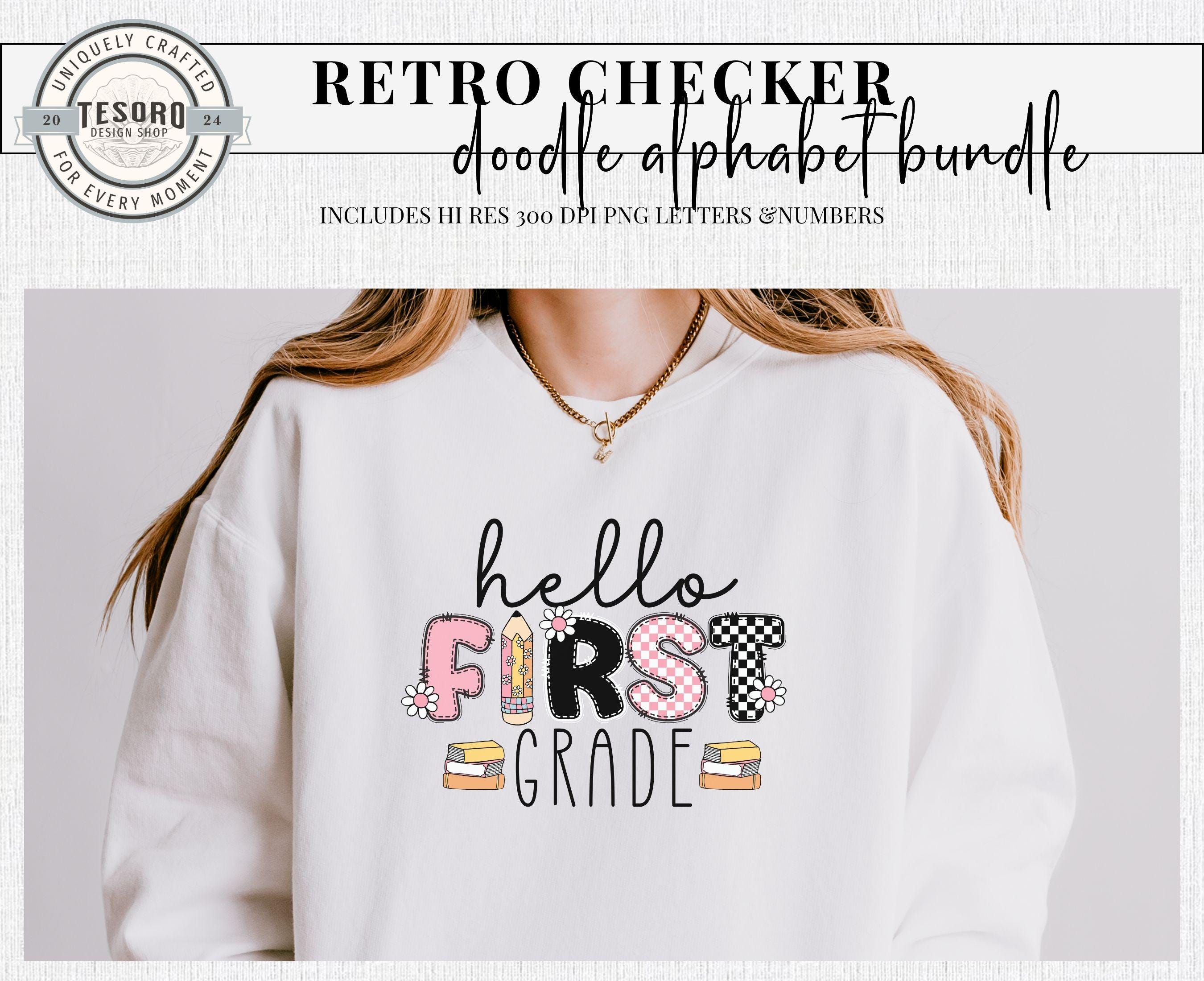 Fun bundle of doodle letters and numbers sets in pink & white checker, black and white checker, pink white and black solids with coordinating bonus school themed clip art. This trendy design is perfect for any school themed designs for shirt, totes or mugs. Files can also be used in print & cut for Cricut and Silhouette to make stickers or class bulletin boards. Make your own teacher shirts with your heat press! These files are hi res 300 DPI PNG so will be great for sweatshirts, t-shirts, fall hoodies, tumblers, mugs, stickers and more! Excellent for for sublimation and DTF printing.