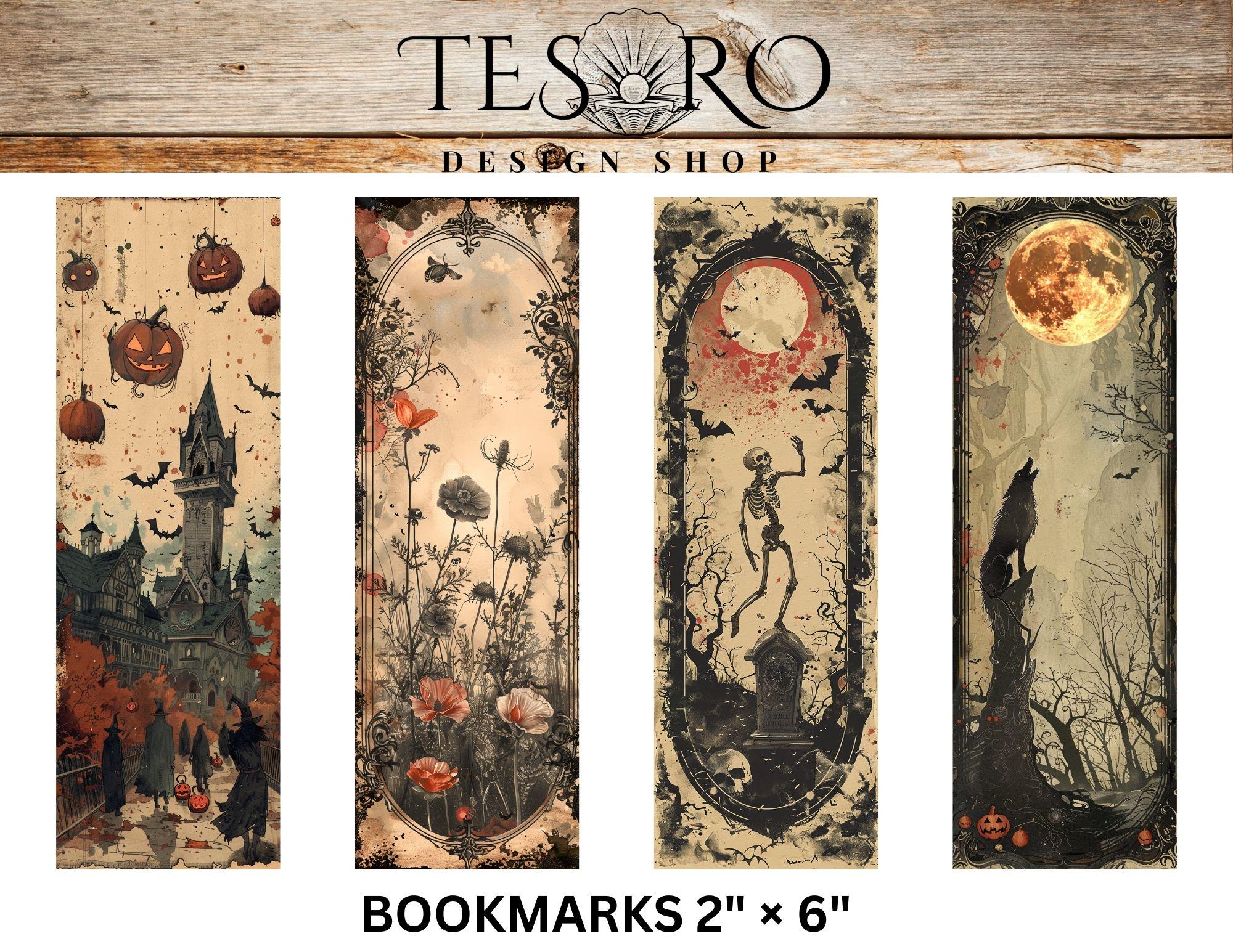 4 unique vintage gothic witchy bookmarks PNG file ready to print. Easy to use print and cut on Cricut or Silhouette. Great for spooky season reading! Make gift to your Book Club!