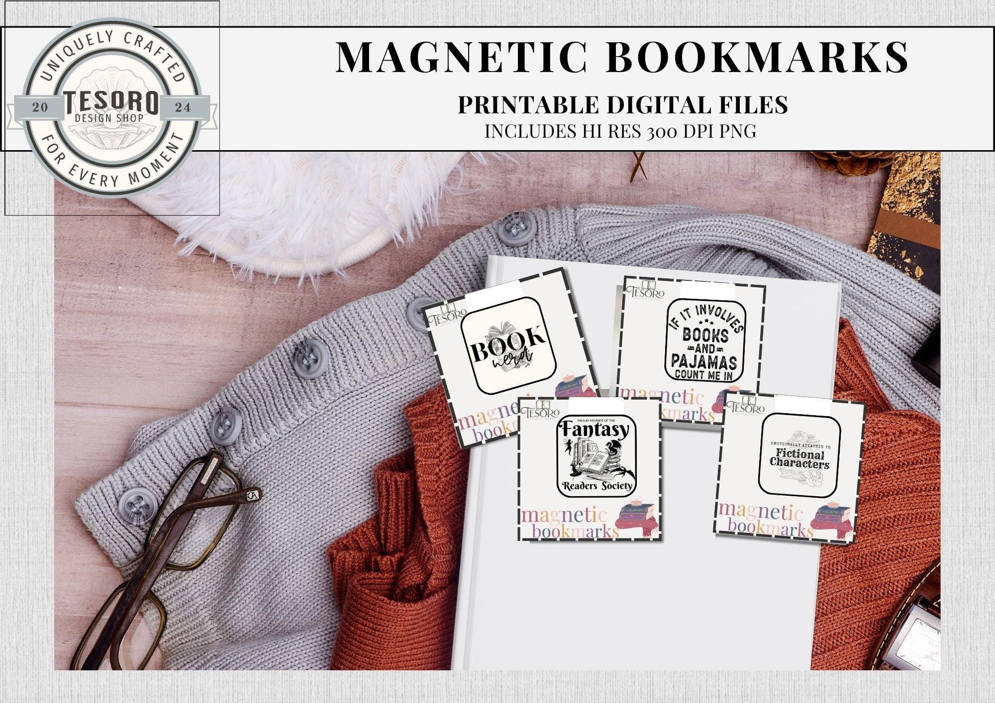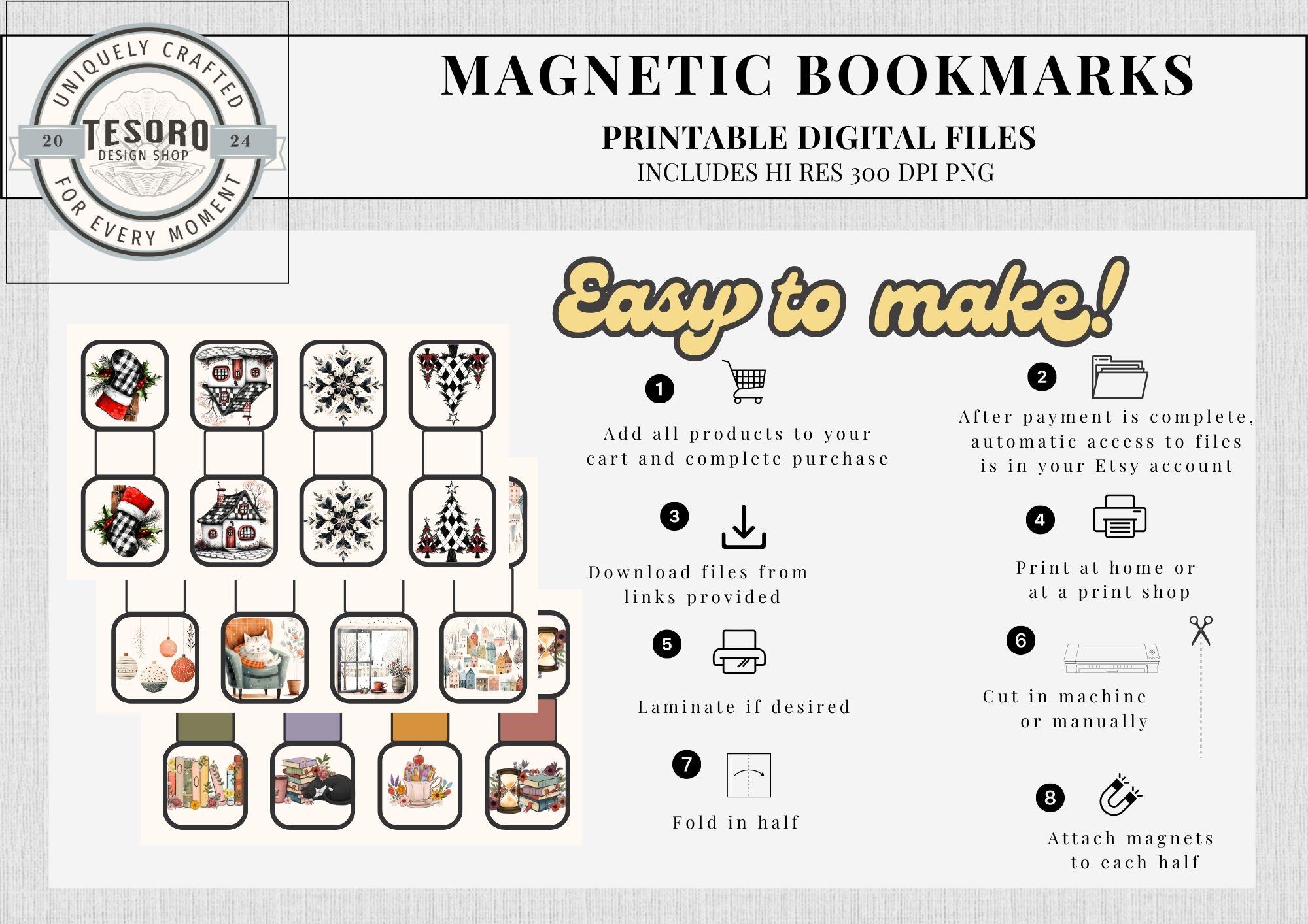 4 unique Bookish printable magnetic bookmarks in a PNG file ready to print. These are easy to use with the print and cut on Cricut or Silhouette. Alternatively, you can use scissors or an exacto knife for a manual approach. Great for book lovers of of all genres. Makes a cute DIY gift for teachers, librarians, book sellers and members of book clubs.