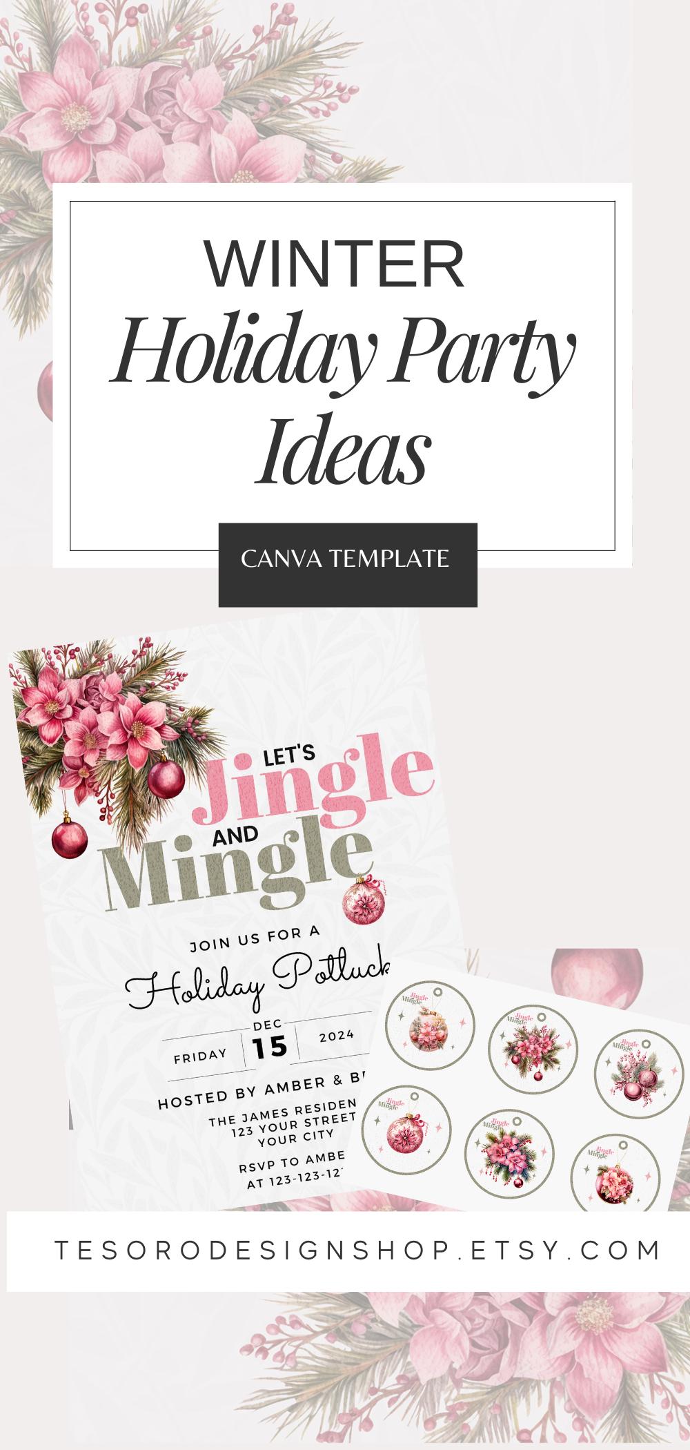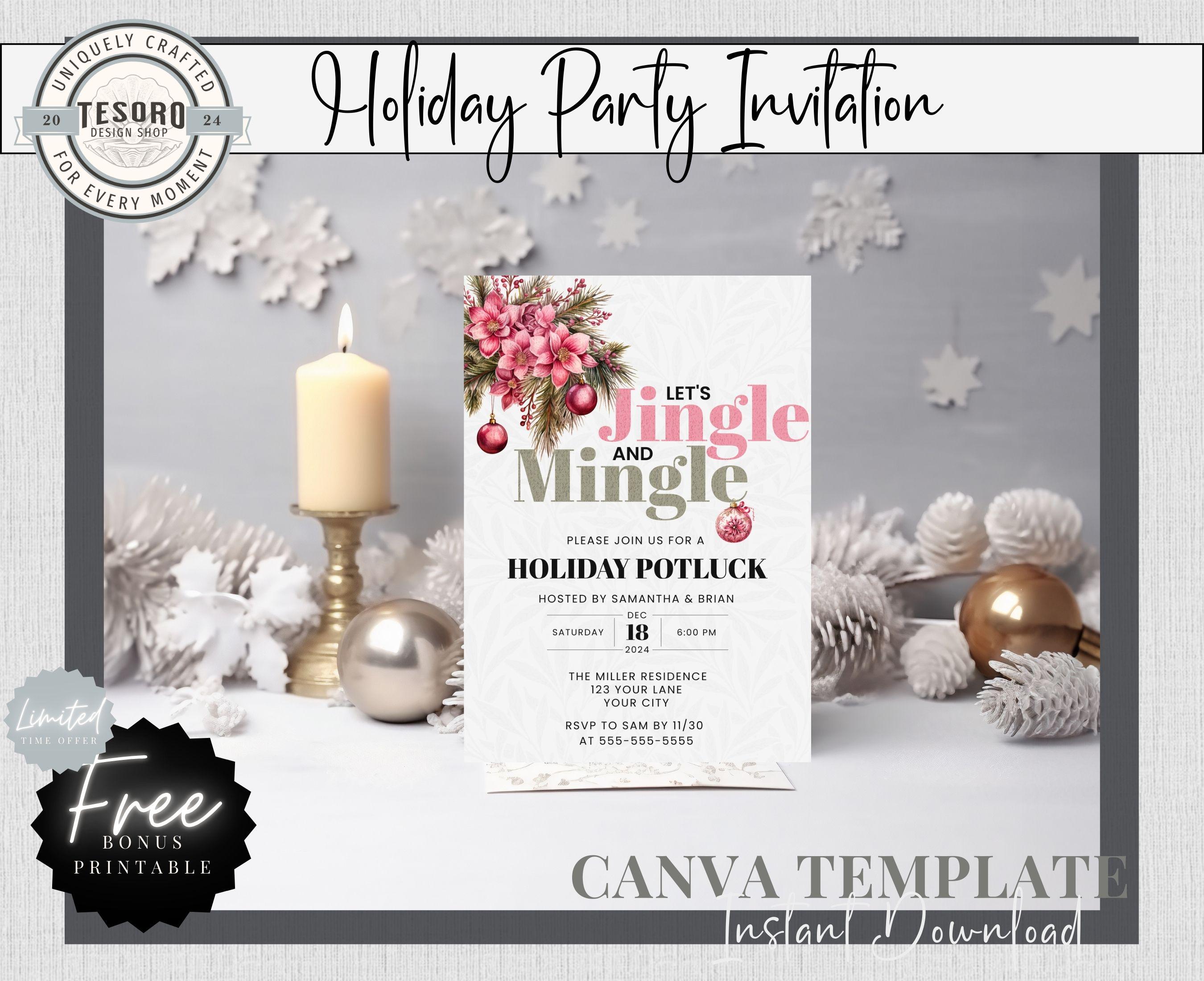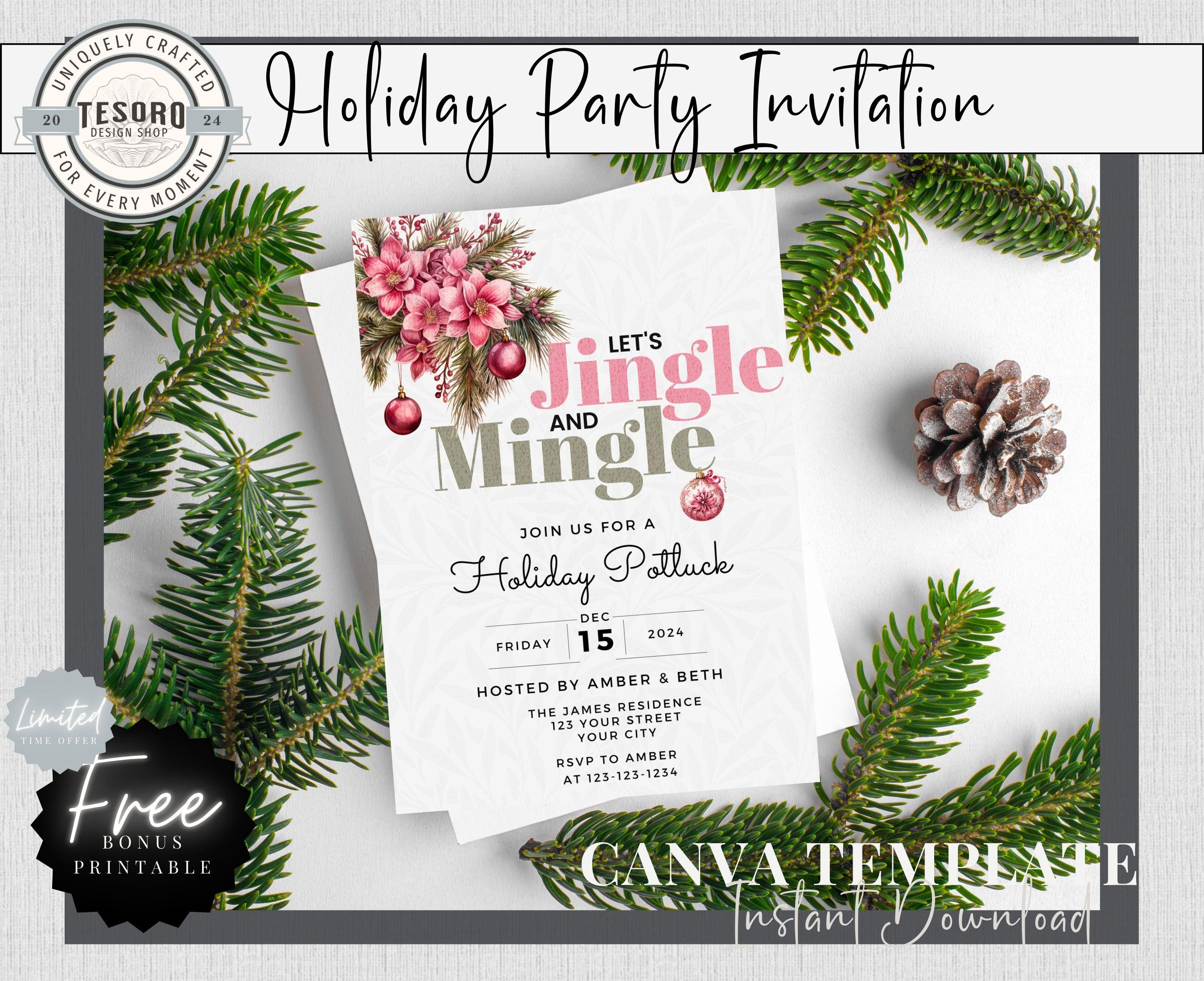 Host a magical holiday celebration with this charming Winter Holiday Party Invitation Template! Featuring a cozy Jingle & Mingle pink design with a complimentary poinsettia florals, this invitation is perfect for Christmas parties, Friendsmas gatherings, or any festive winter event.
