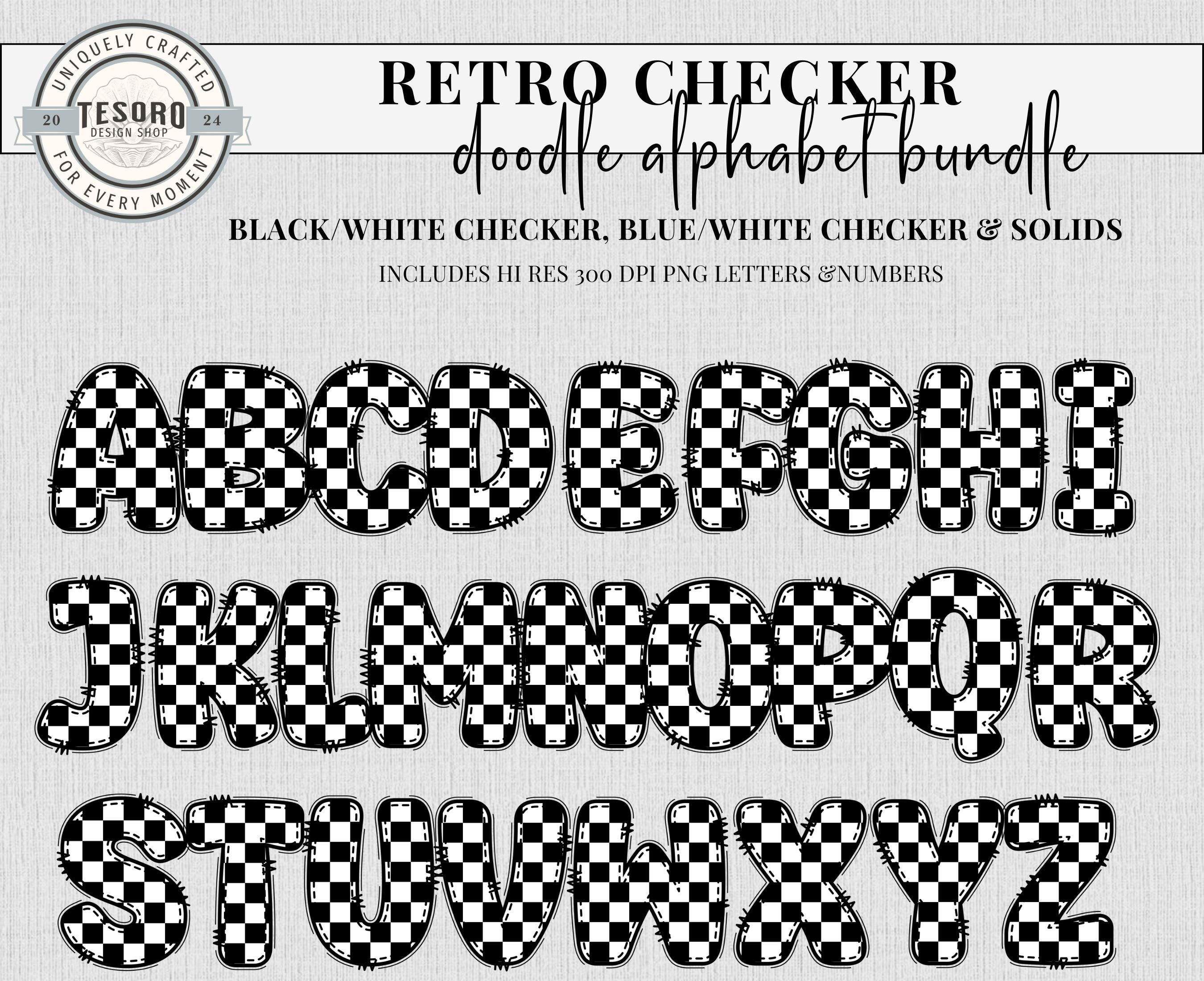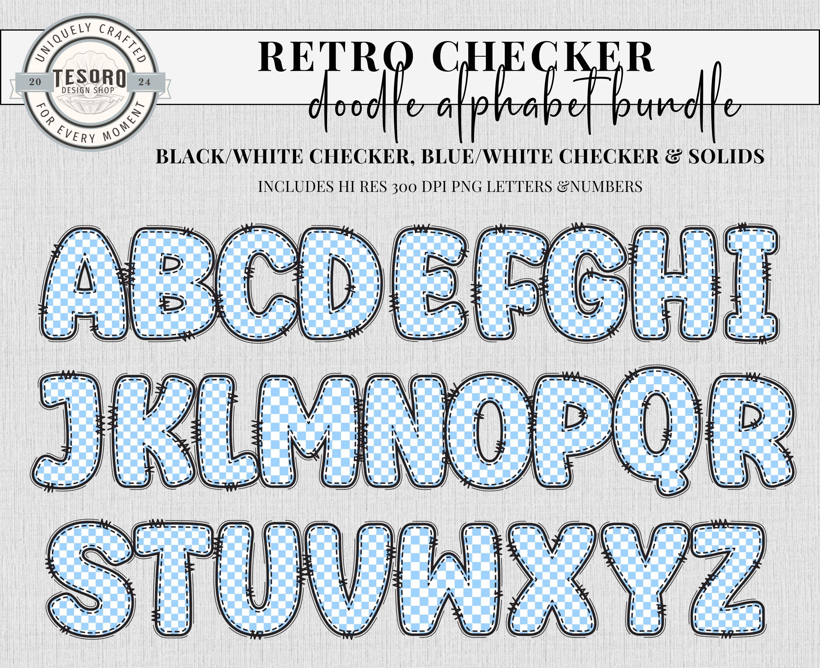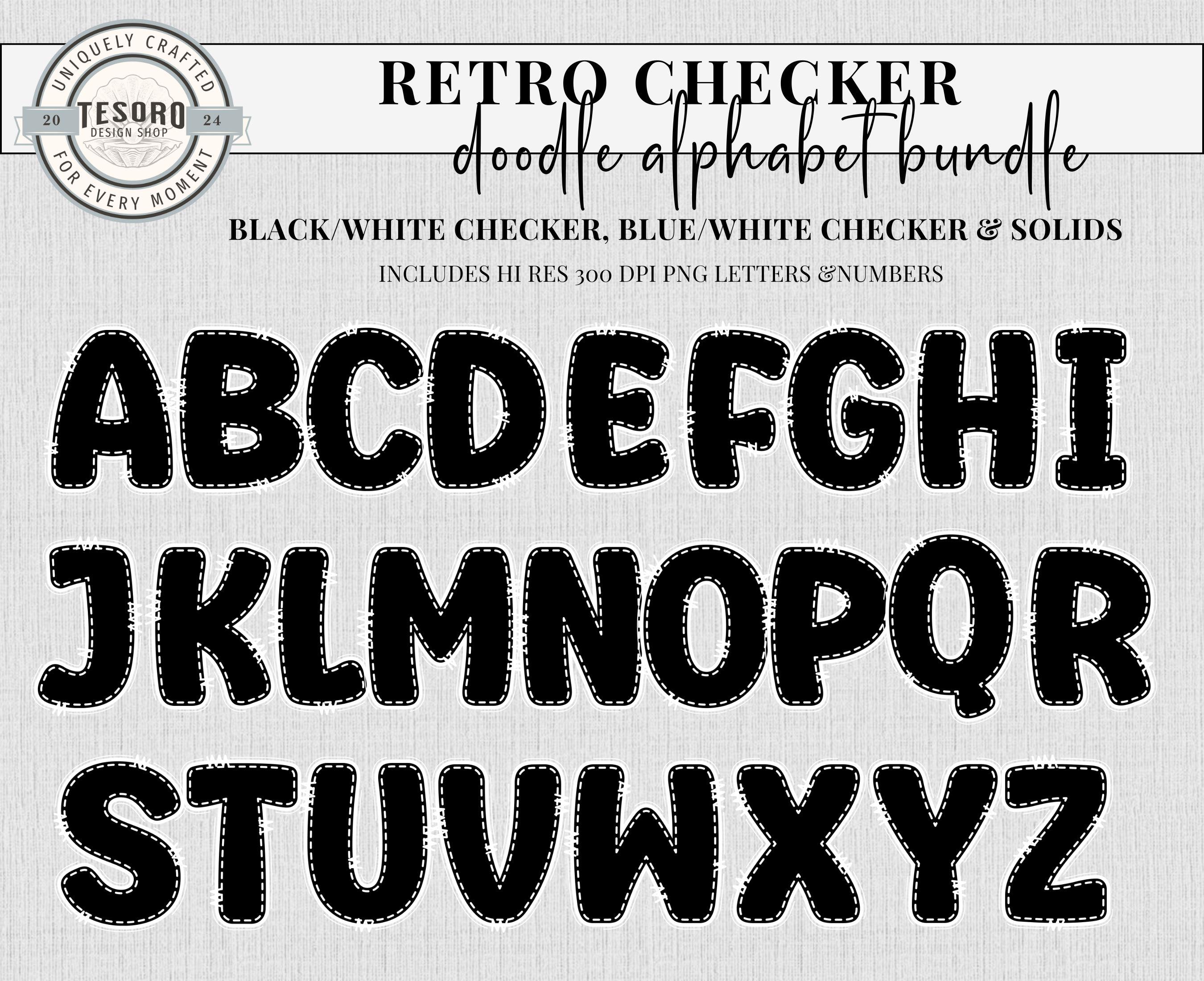 School Classroom Decor Printable | Cute Trendy Alpha A-Z Set |Alphabet Bundle Doodle PNG | Black and Blue Checker Retro Letters School Teacher PNG | Classroom Bulletin Board Clipart | Instant Download | Sublimination File