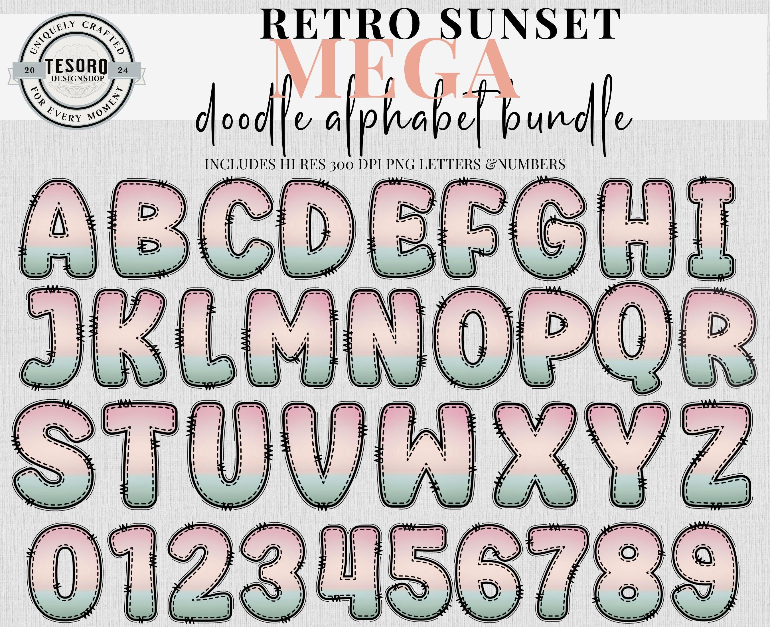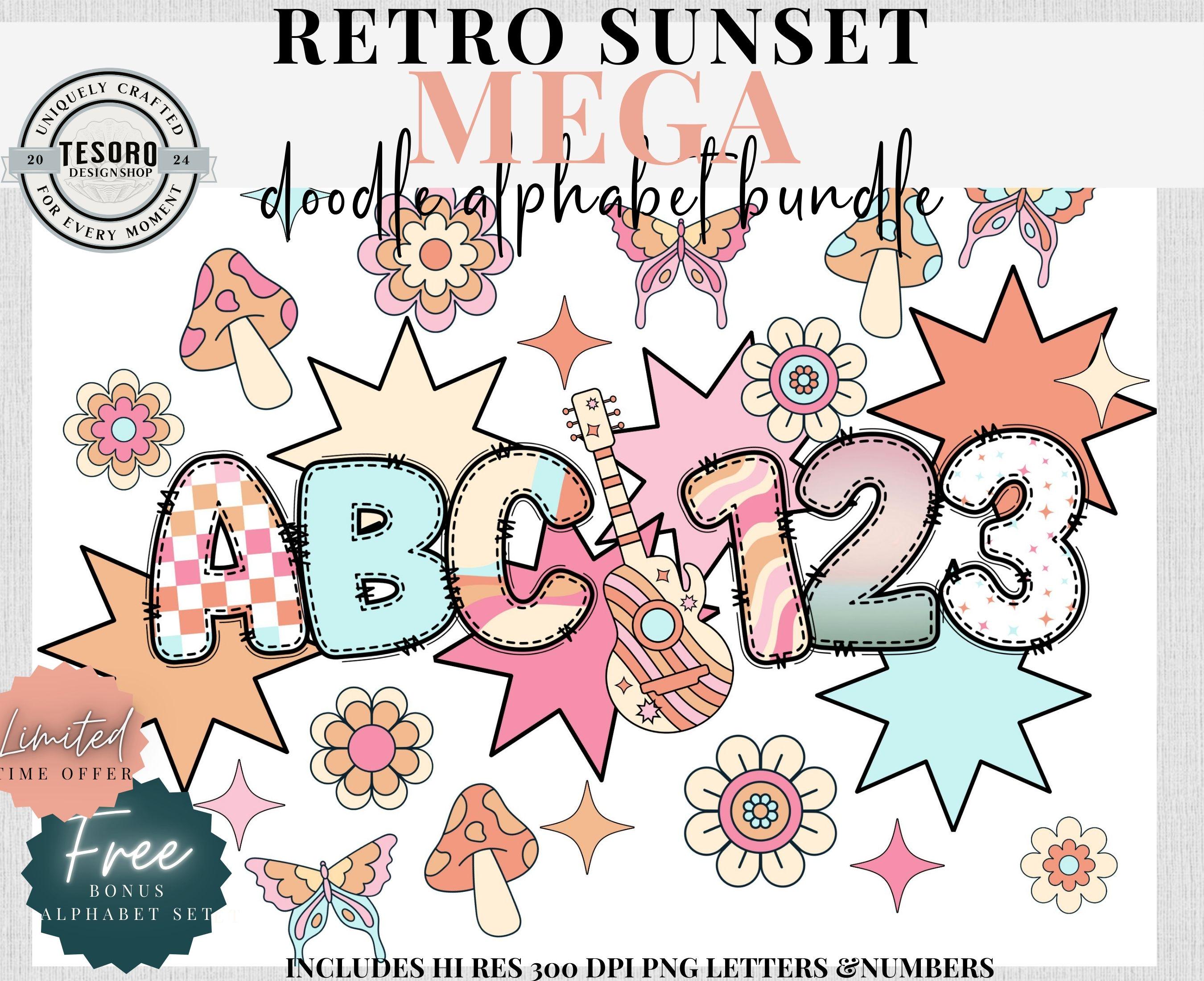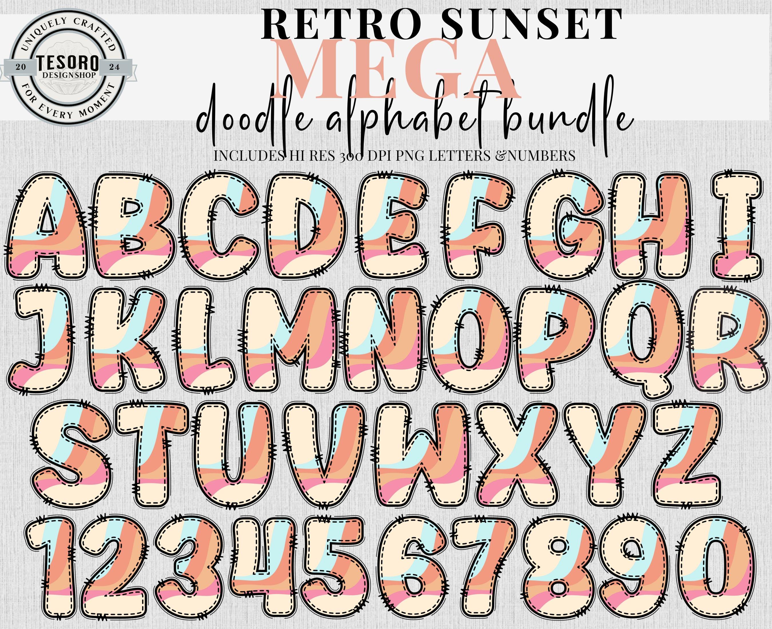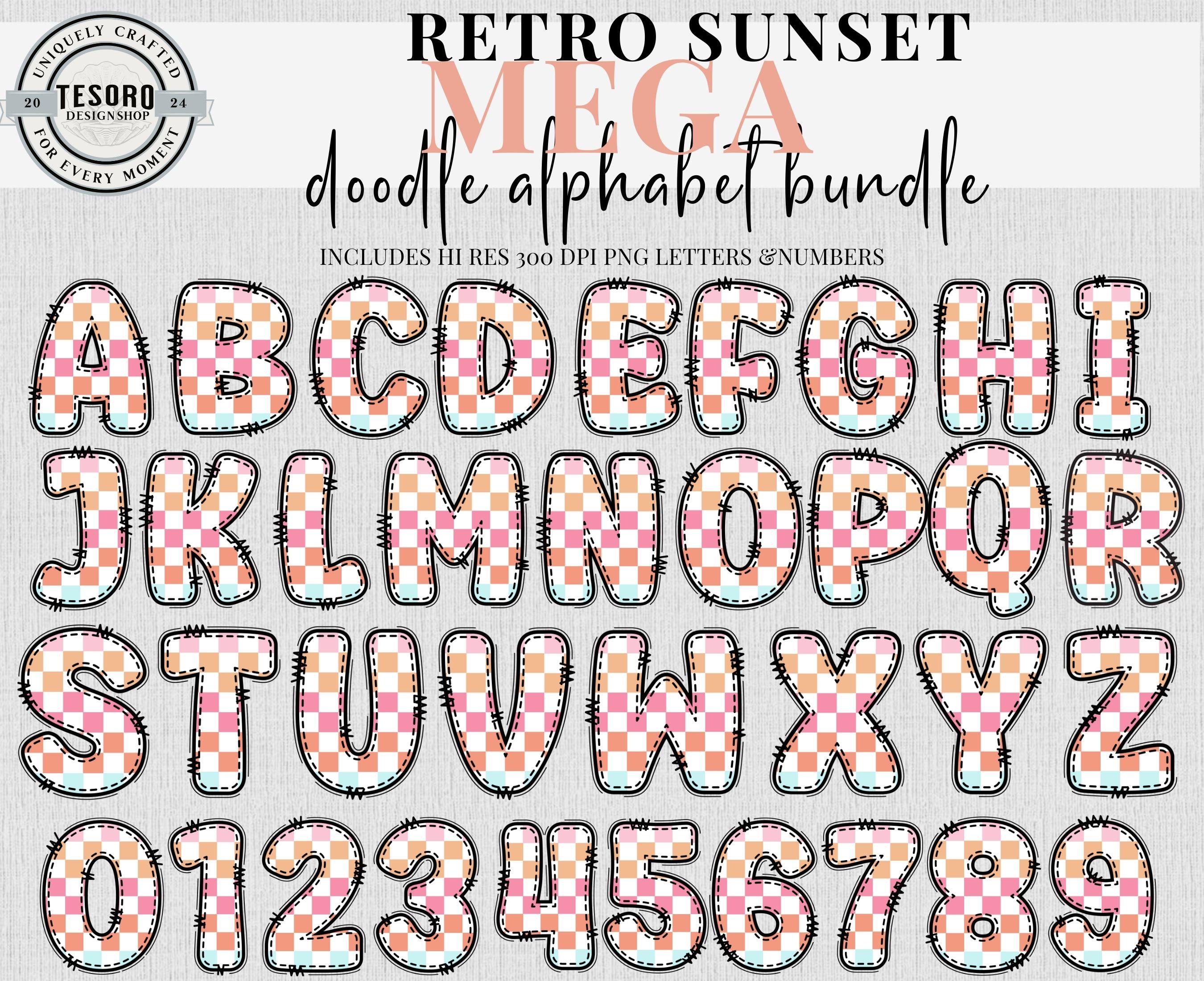 Available as an instant download for quick, easy use in digital or print designs! Mega bundle of doodle letters and numbers sets in 9 designs/colors - checker pattern and solid designs. Bonus of matching retro clip art. This trendy design is perfect for addition for text based designs or to add text to your design. Excellent for for sublimation and DTF printing for shirt, totes or mugs. Digital files can also be used in print & cut for Cricut and Silhouette to make stickers or class bulletin boards. Make your own shirts with your heat press! These files are hi res 300 DPI PNG so they can be resized and retain quality printing.