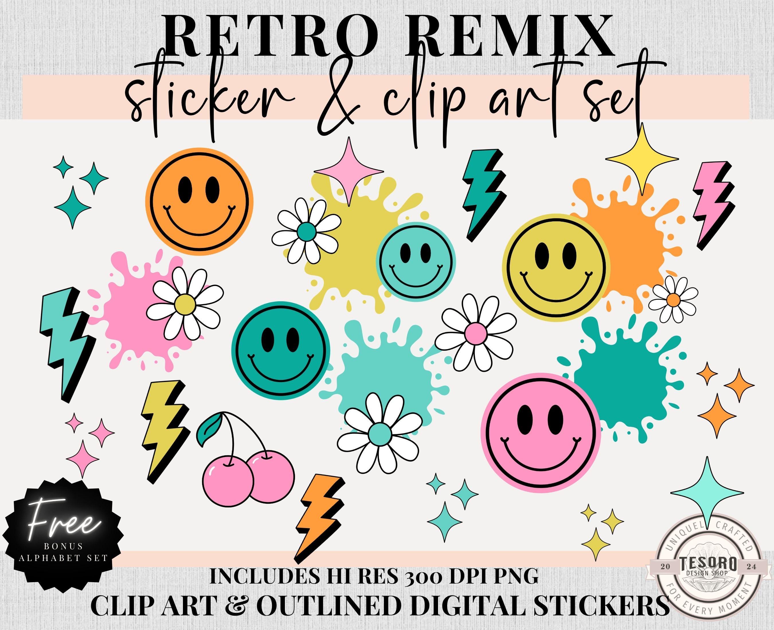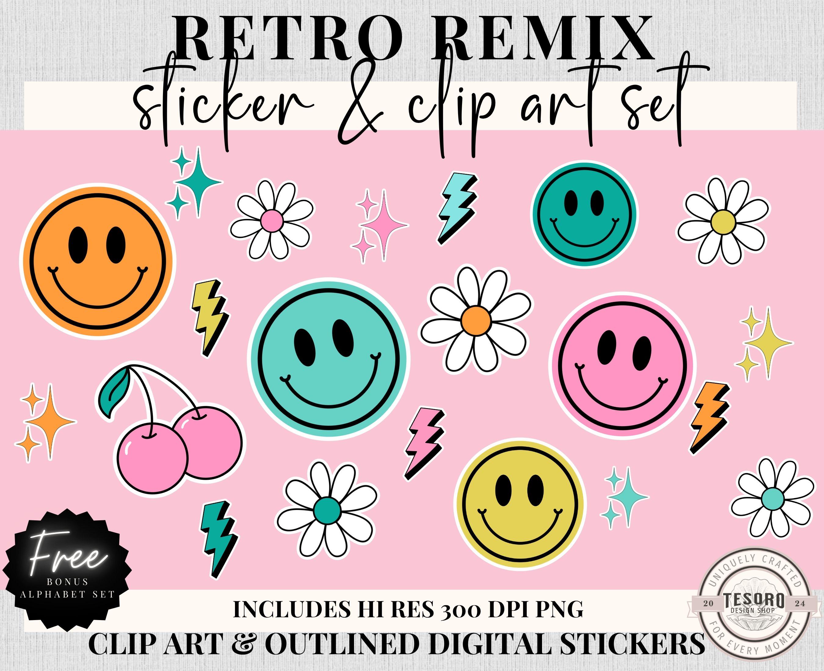 Old Skool!! Elevate your creative projects with the Retro Remix Clipart and Sticker Bundle PNG – featuring 90's retro designs. Perfect for kindle stickers, scrapbooking, junk journals, teachers, digital planners, paper planners, etc. This printable PNG bundle brings a retro vibe with a 90's inspired color palette and images of daisies, cherries, lightening, smileys and more.