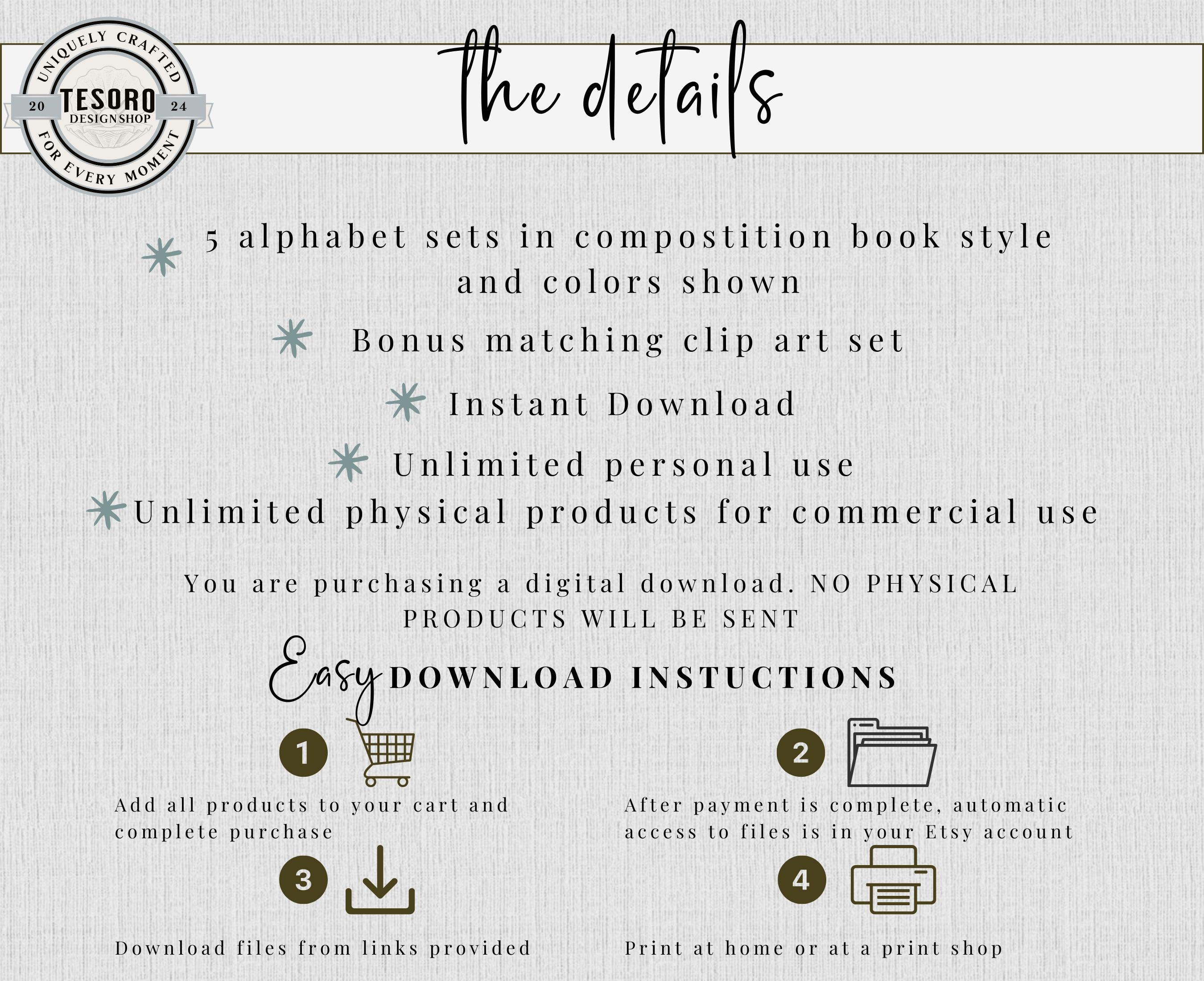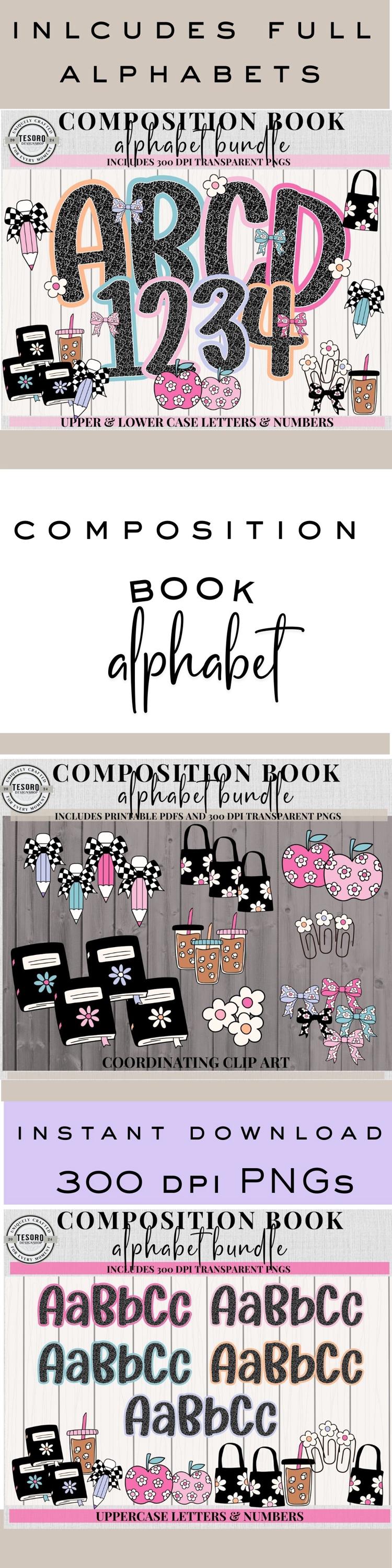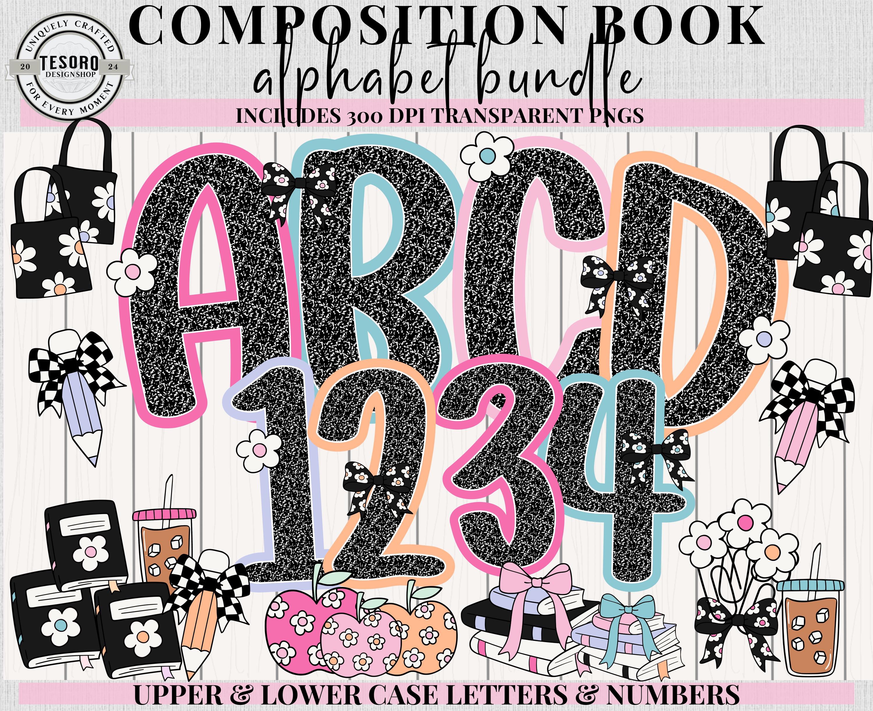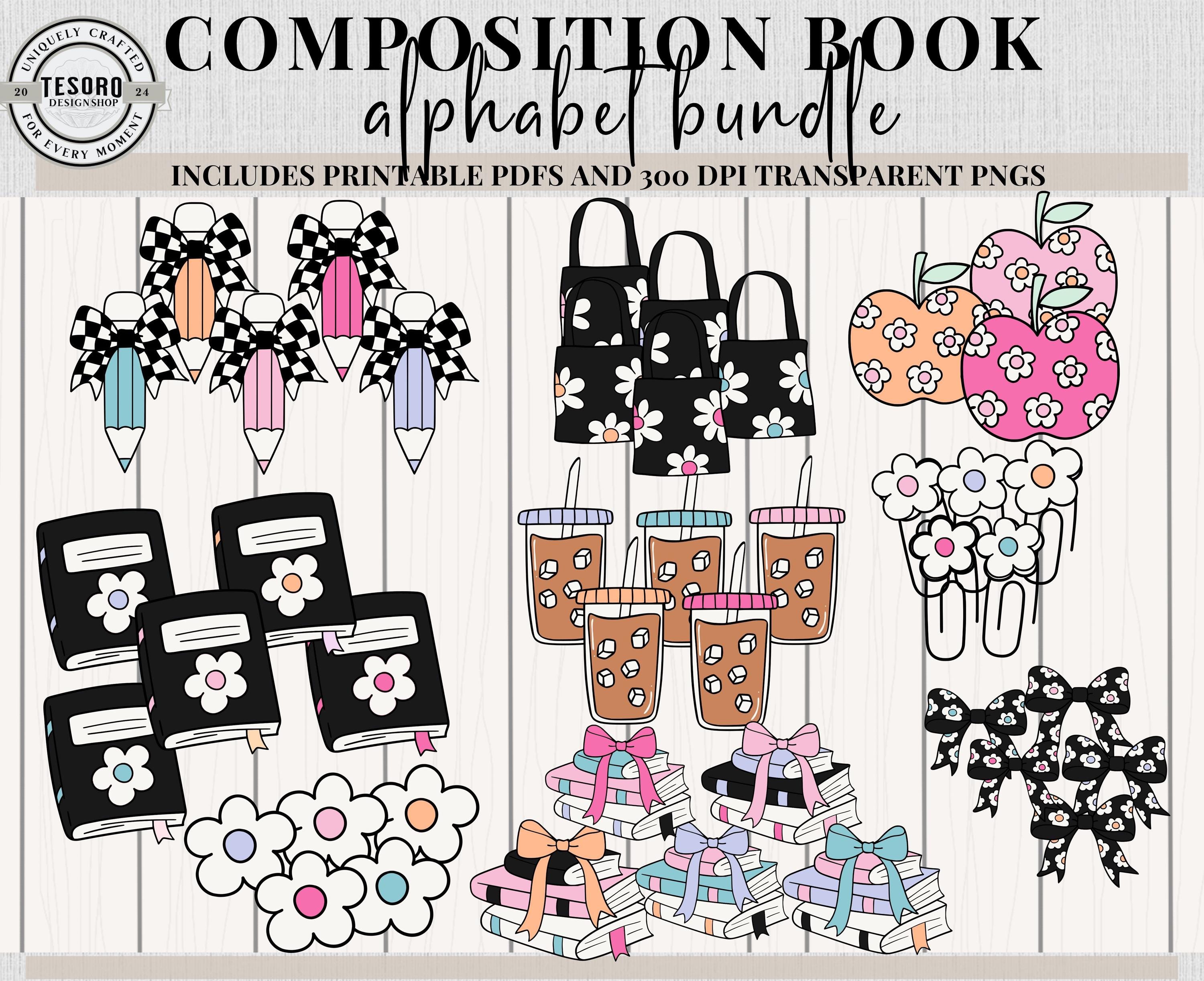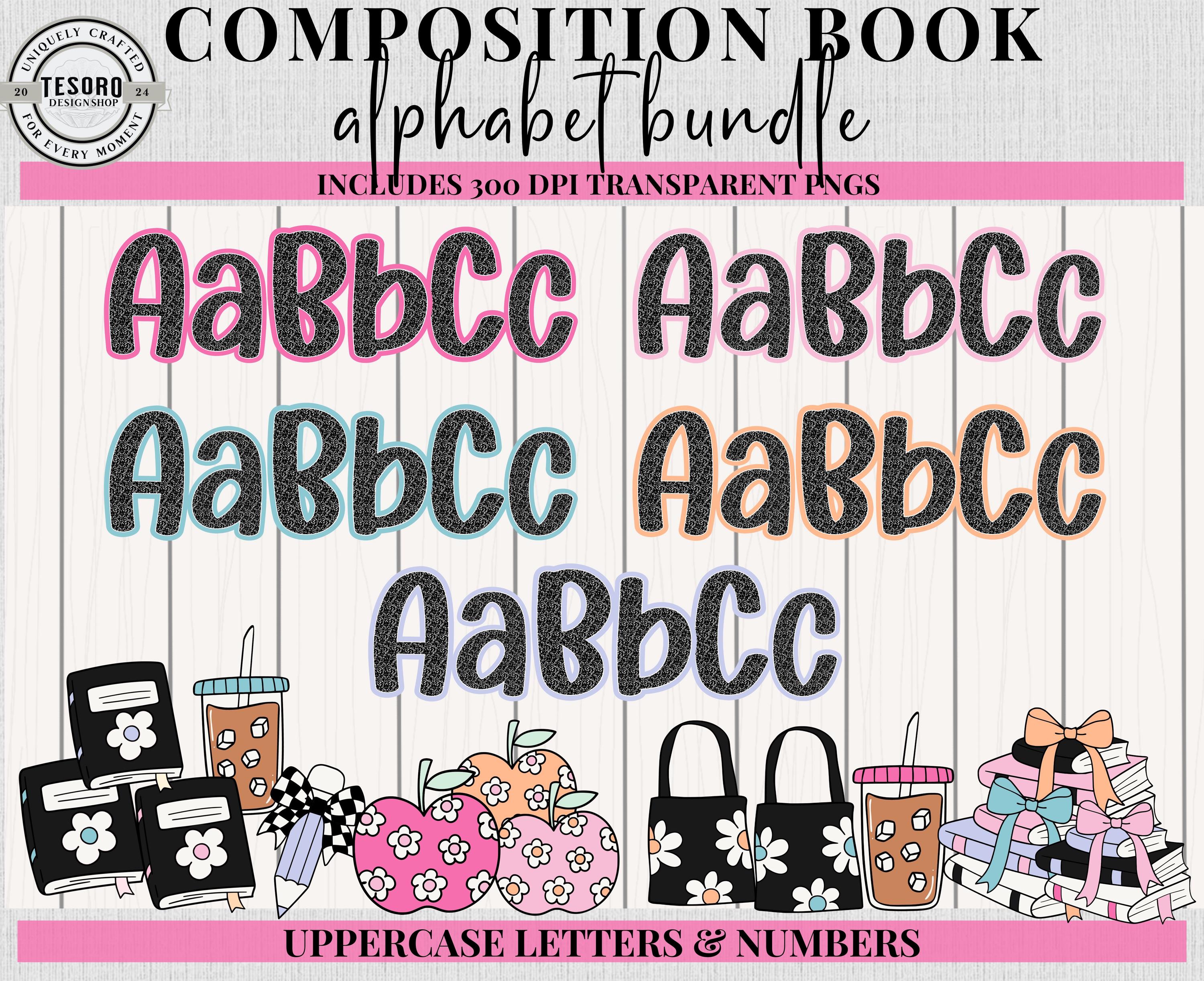 Add a playful academic vibe to your classroom, homeschool space, or crafting projects with the Composition Book Alphabet & Clip Art Bundle. Featuring 5 complete alphabet sets with colorful borders and coordinating clip art (pencils, apples, bows, bags, drinks, and more), this versatile set is perfect for bulletin boards, classroom posters, teacher gifts, or custom apparel.