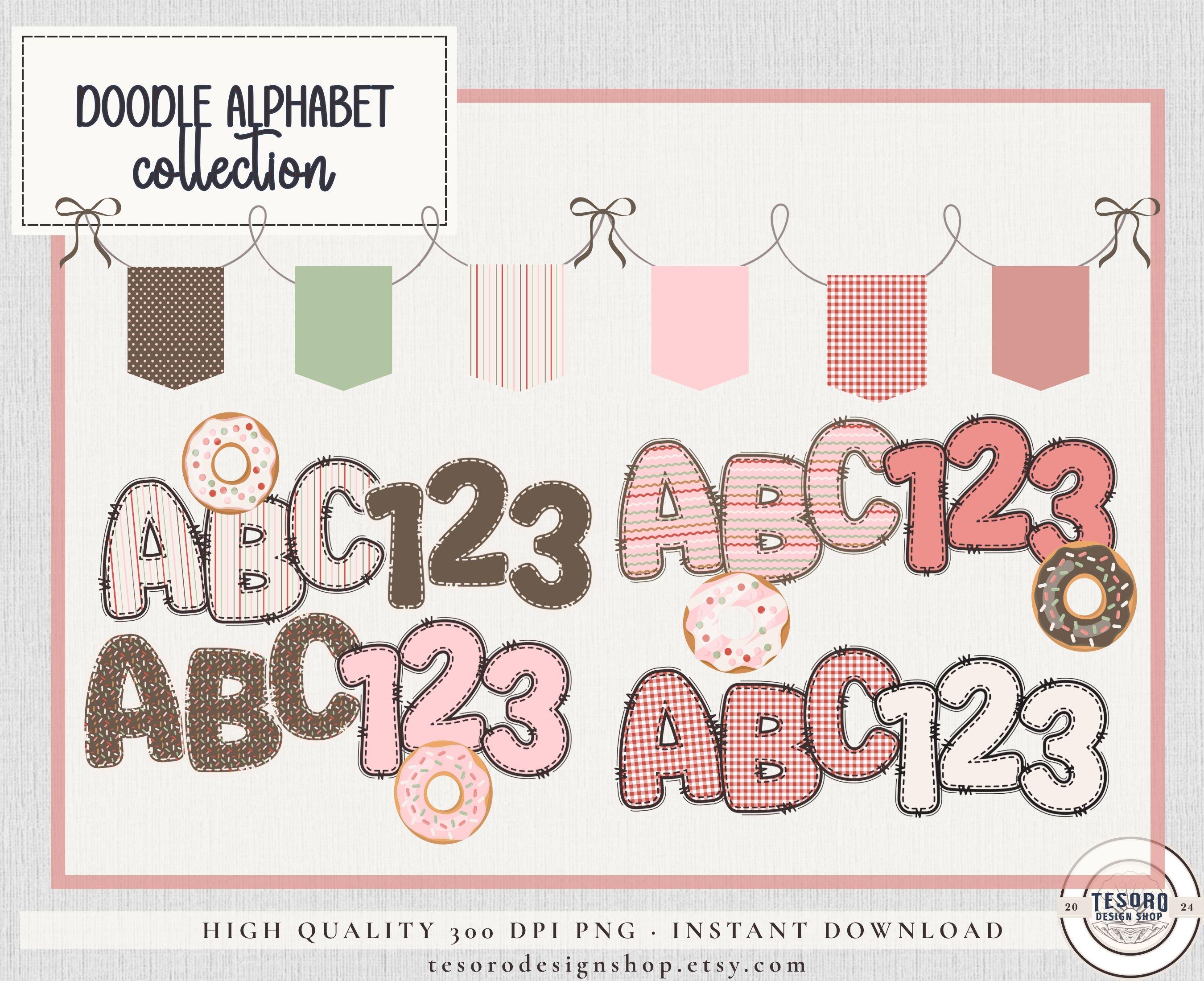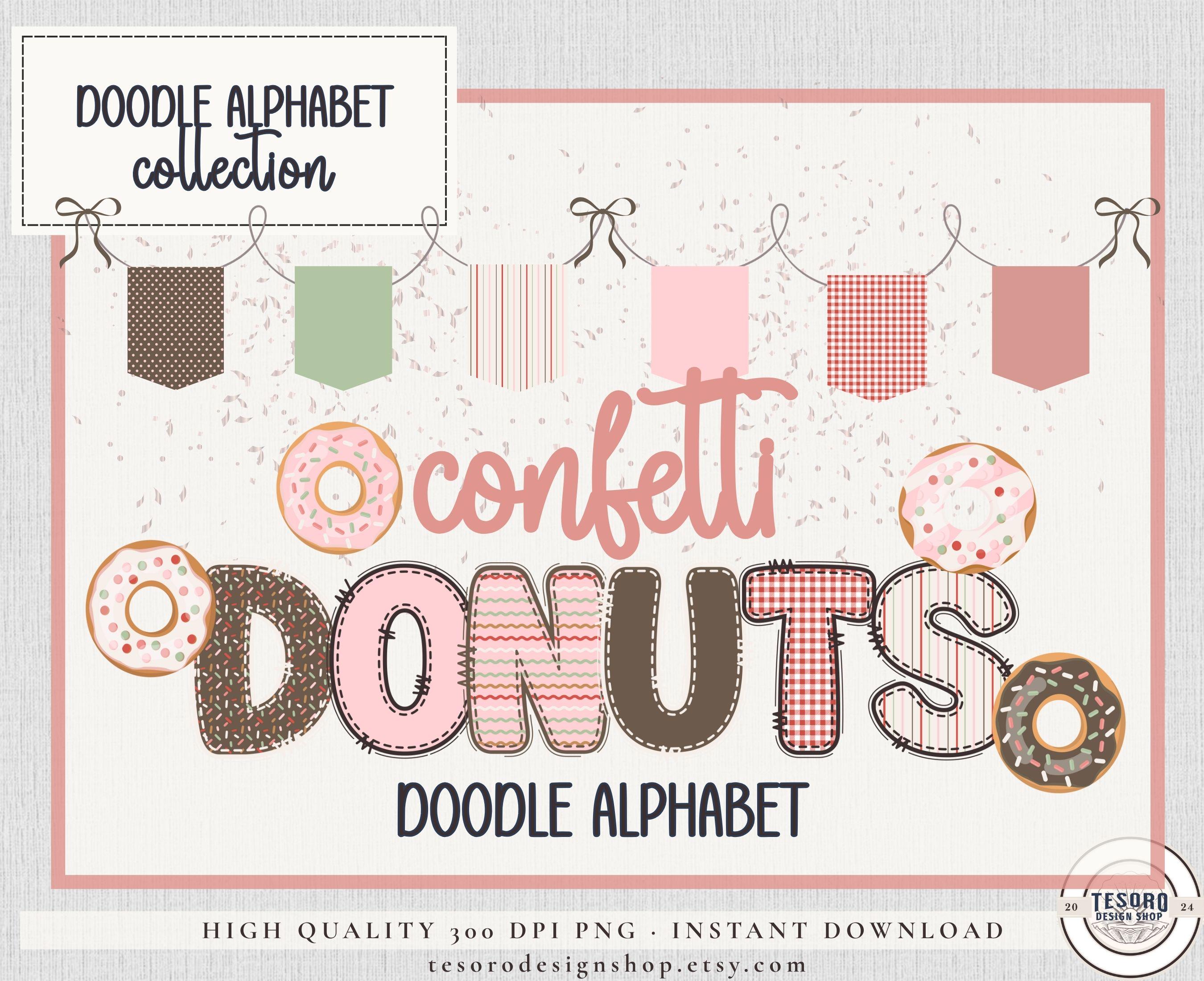 This Confetti Donuts doodle alphabet bundle features an original A–Z letter set with pink and green patterns, including gingham, stipes and dots, making it easy to coordinate classroom decor library displays, seasonal displays, and creative projects.