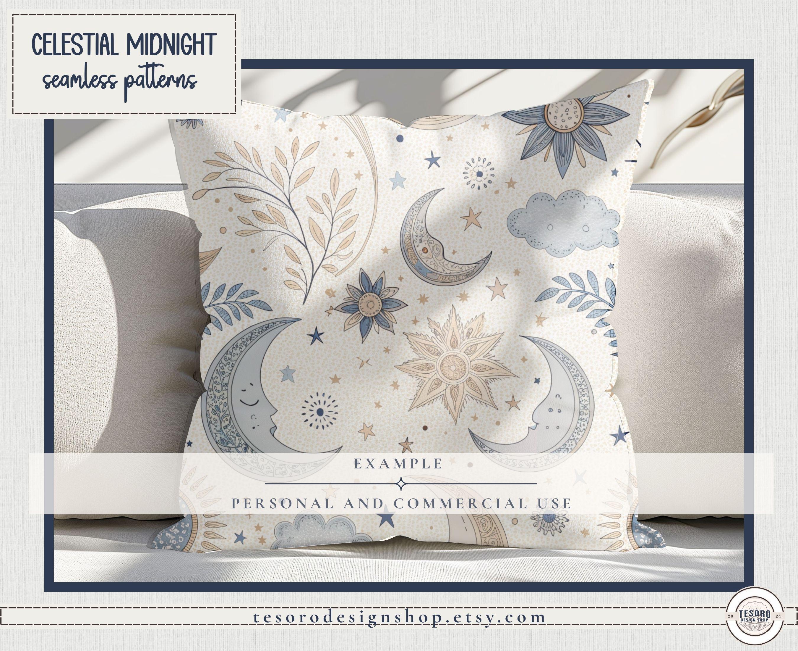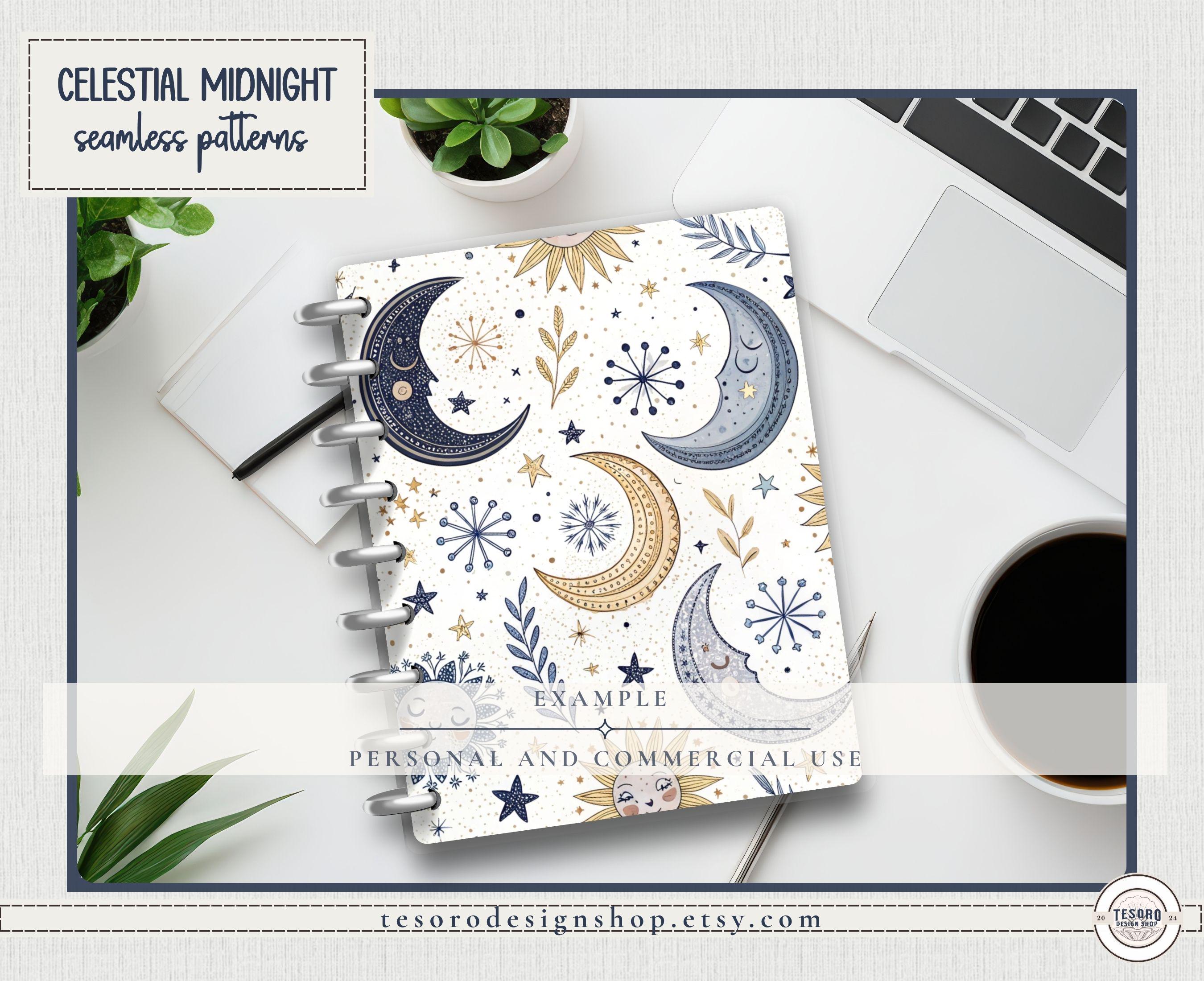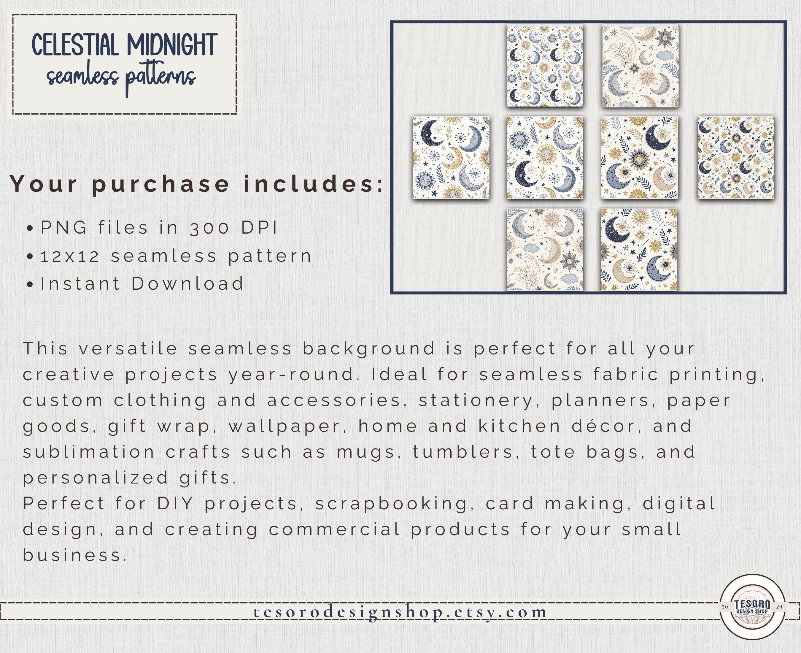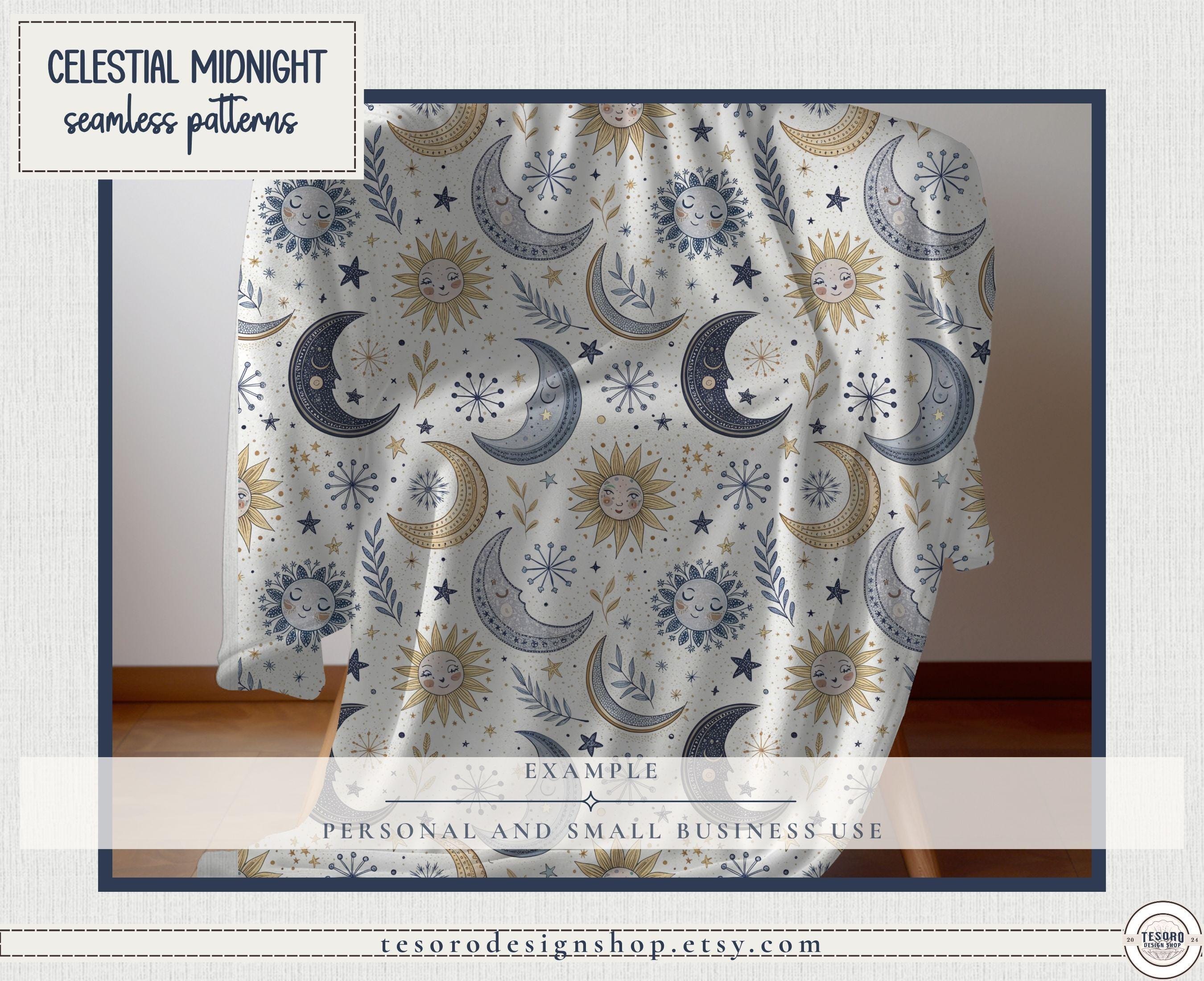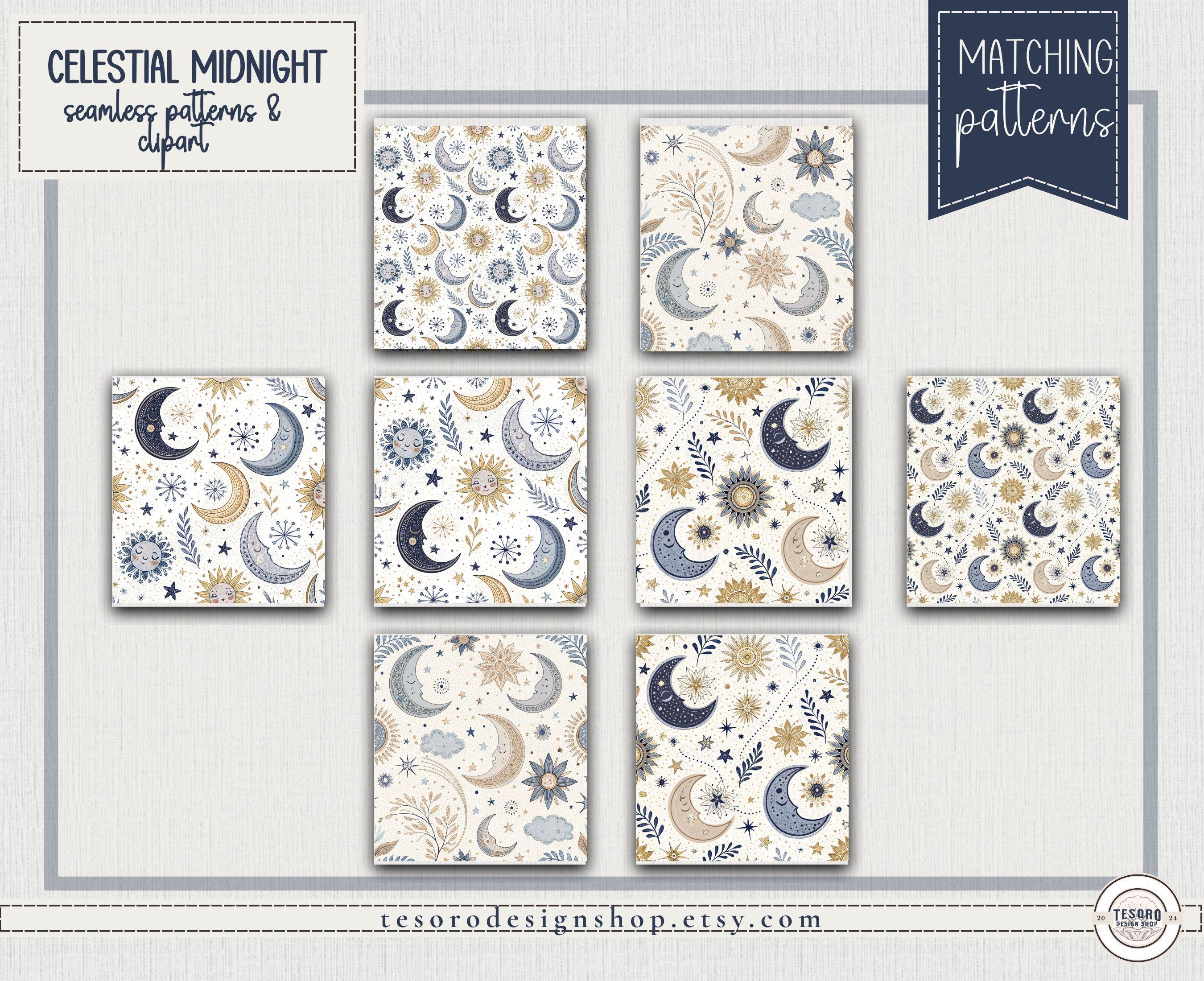 So extra celestial! Create magical, celestial-inspired designs with this Celestial Midnight Seamless Pattern Set, featuring moons, suns, stars, and botanical accents in a modern magical palette of blues and golds.