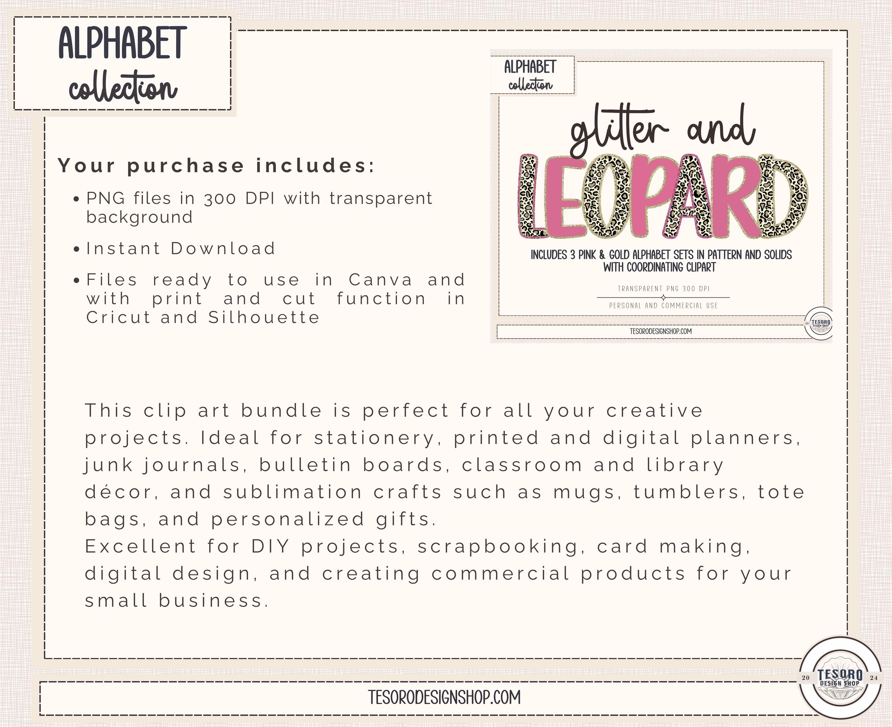 Bring bold, cozy style to your designs with this glitter leopard alphabet PNG bundle, featuring coordinating pink and gold alphabet sets with matching clip art. This versatile alphabet collection is designed for creatives who want eye-catching lettering that feels playful, polished, and modern.