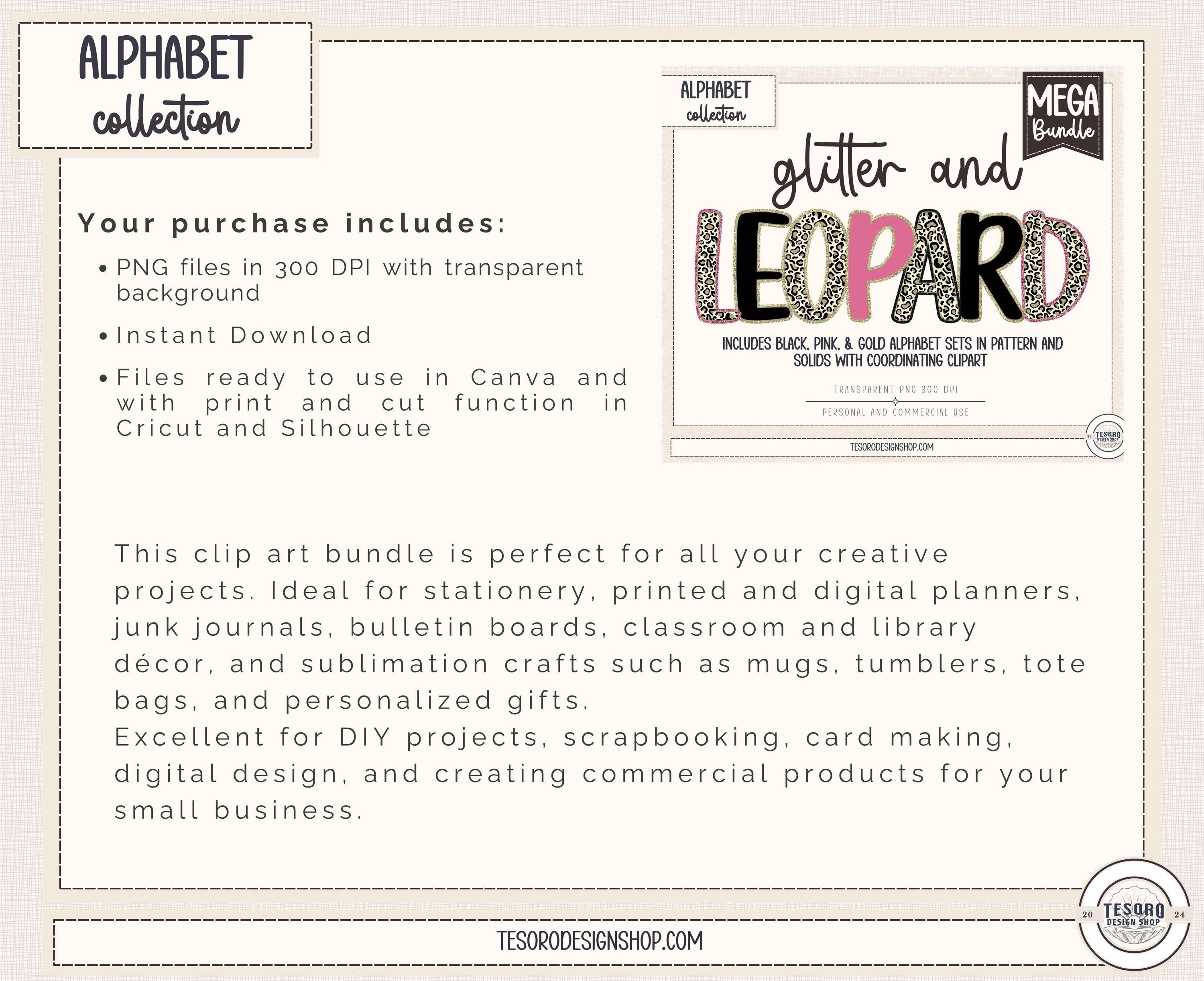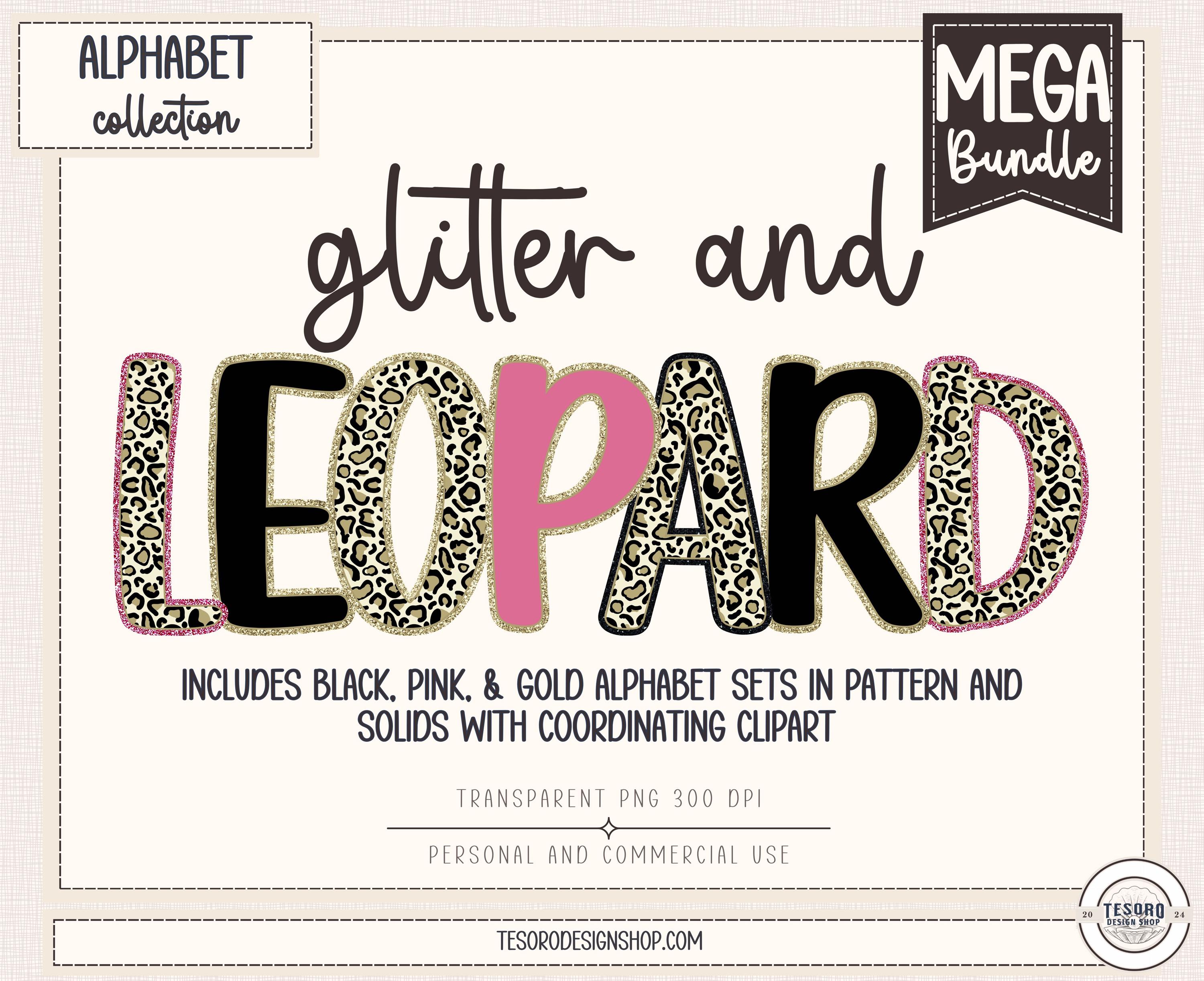 Bring bold, cozy style to your designs with this glitter leopard alphabet PNG bundle, featuring coordinating pink, black, and gold alphabet sets with matching clip art. This versatile alphabet collection is designed for creatives who want eye-catching lettering that feels playful, polished, and modern.