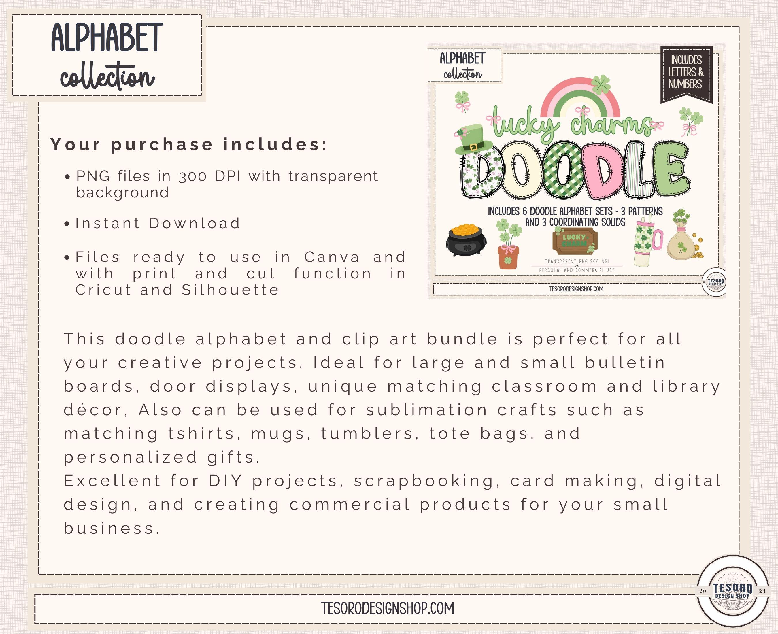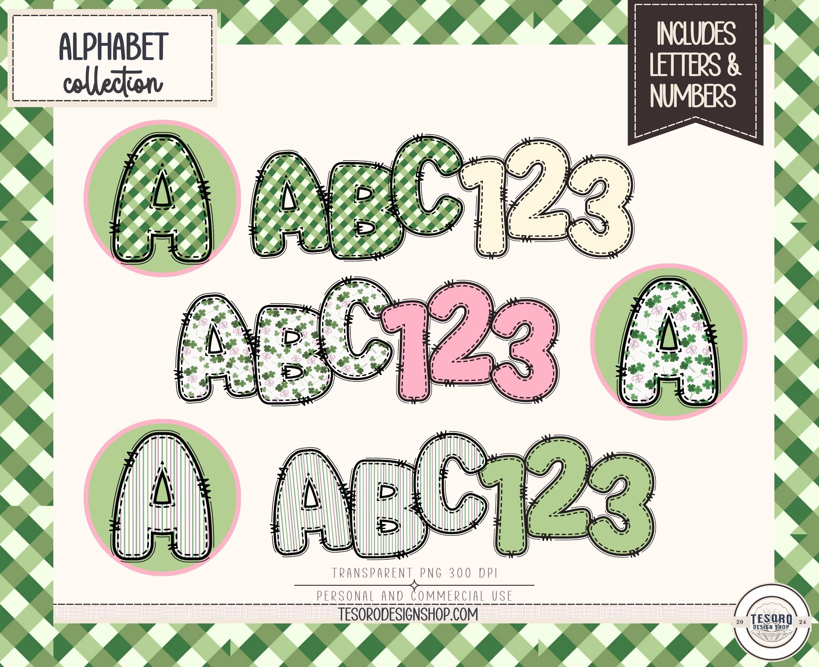 This doodle alphabet PNG bundle features a charming Lucky Charm theme with gingham, shamrocks, stitched details, and coordinating solids — perfect for creating custom titles, sublimation designs, classroom decor, and small business products.