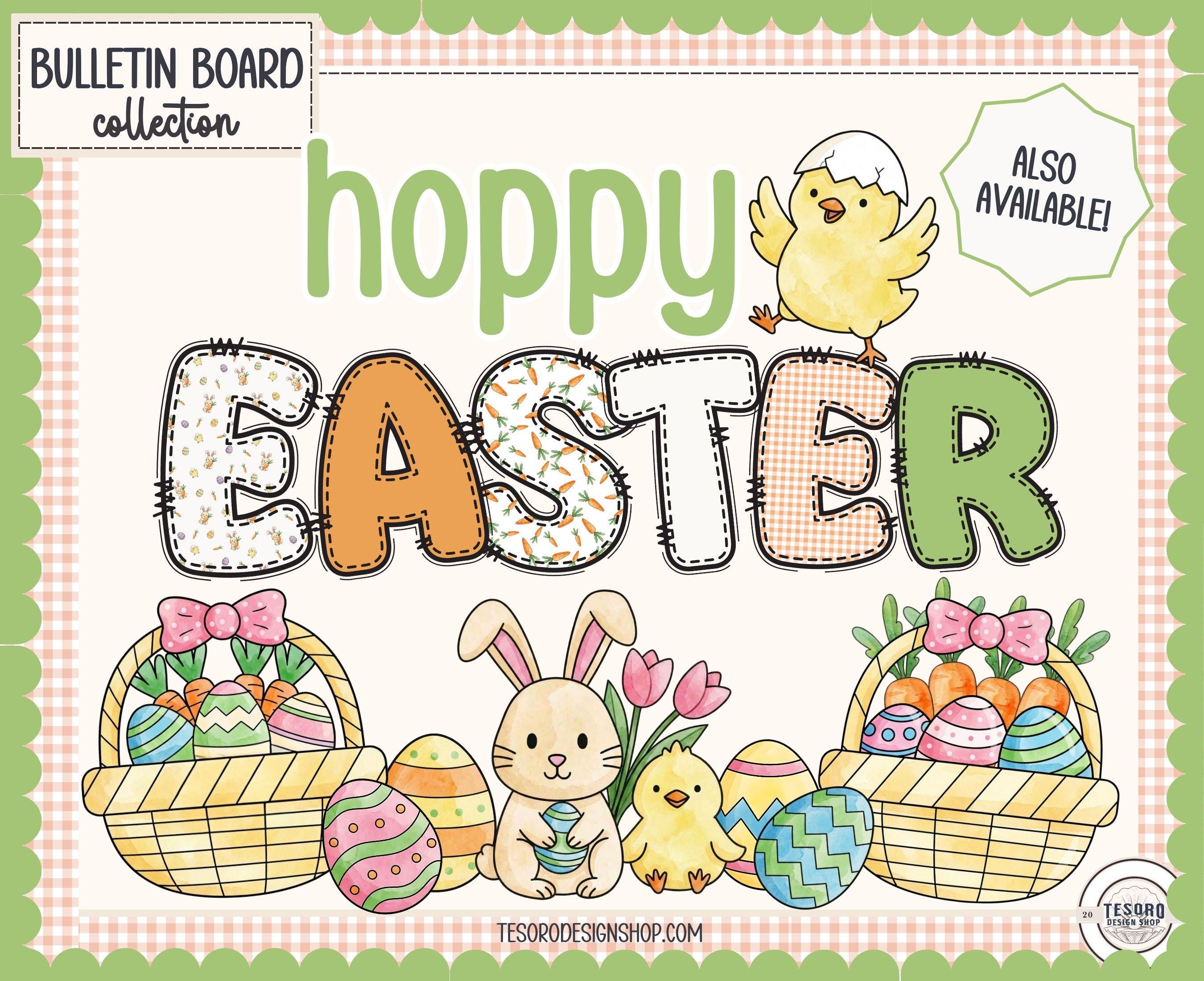 Celebrate the season with this cheerful Carrot Patch “Hopping Into Spring” classroom bulletin board, featuring playful bunnies, chicks, carrots, tulips, and Easter eggs in a soft pastel spring palette.