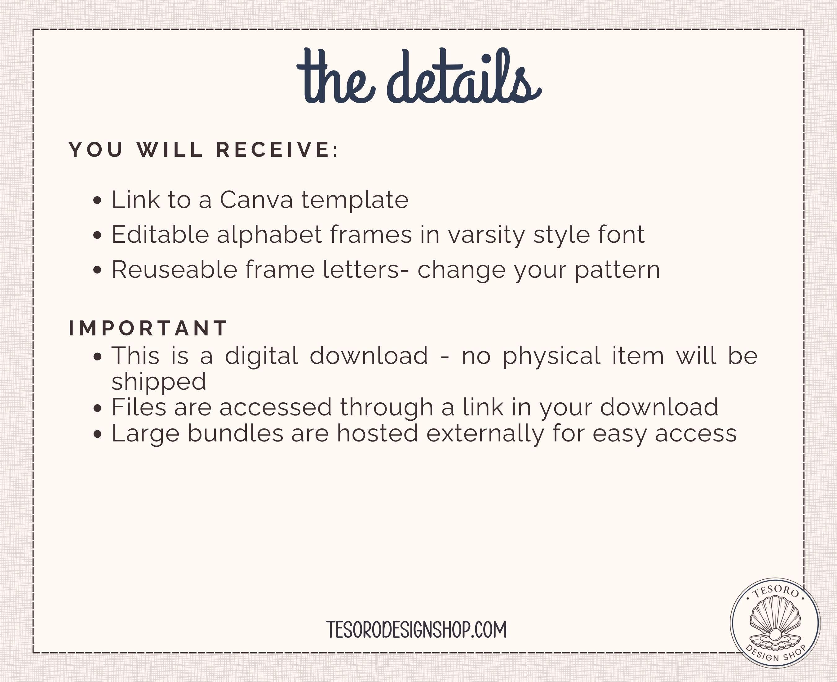 This listing includes a Canva template with fully editable alphabet frames that allow you to easily customize colors, patterns, and designs.