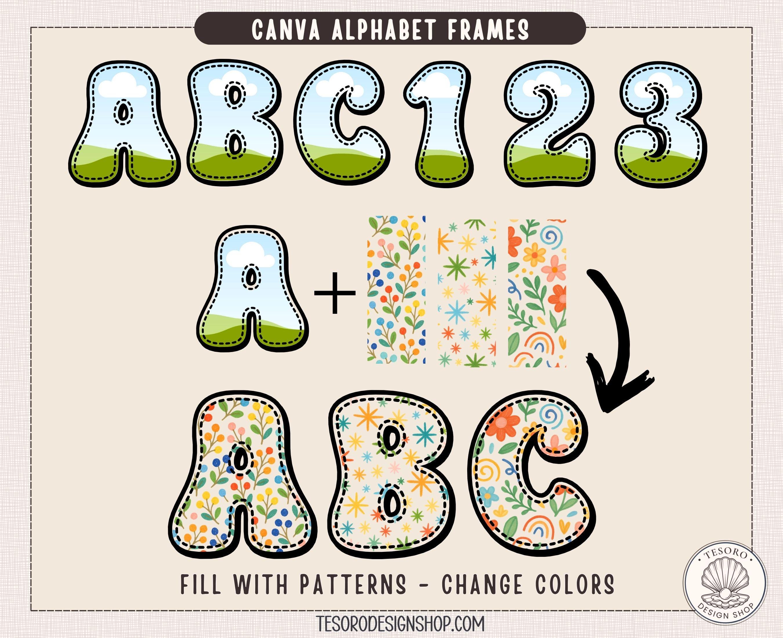 This listing includes a Canva template with fully editable alphabet frames that allow you to easily customize colors, patterns, and designs.