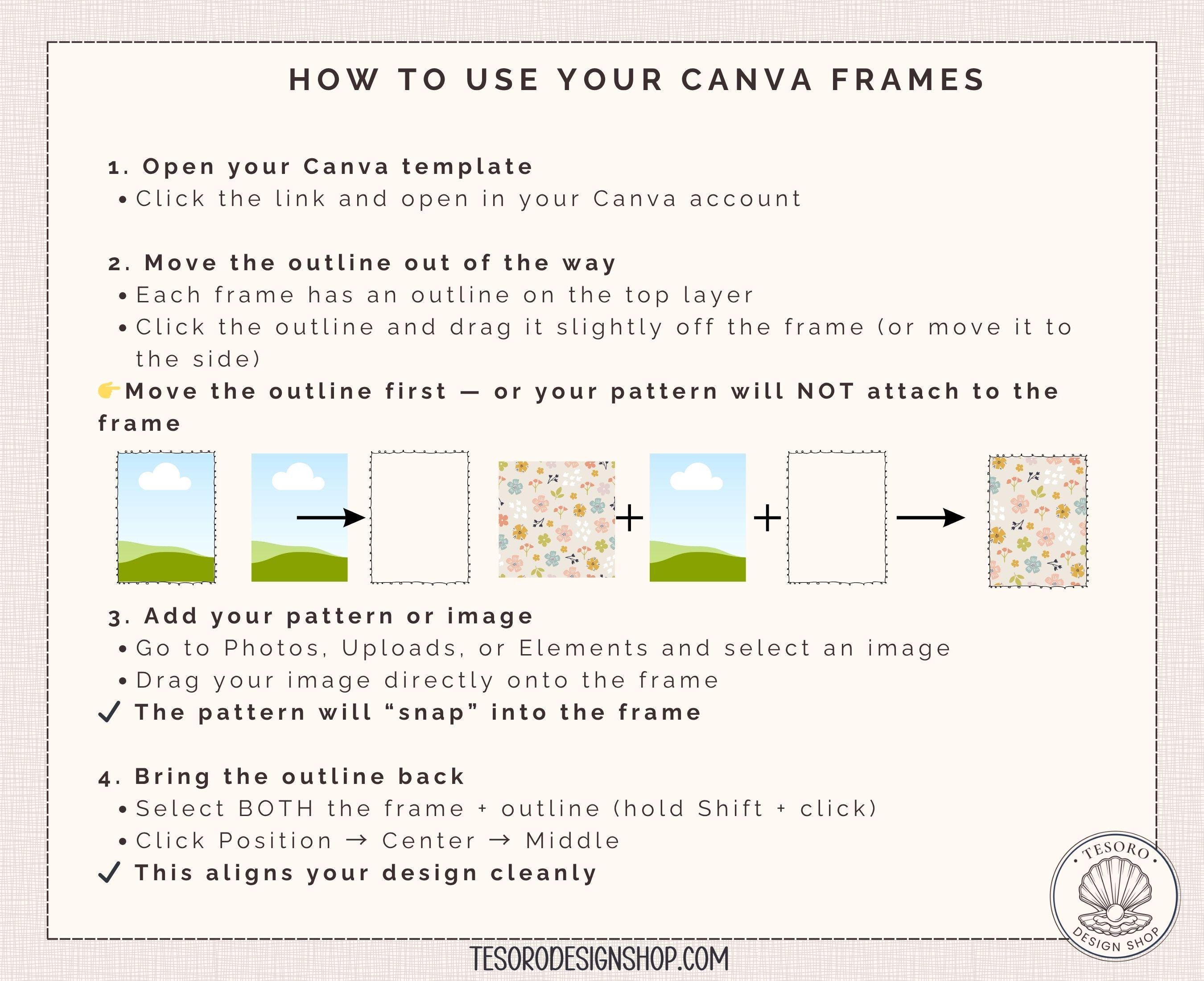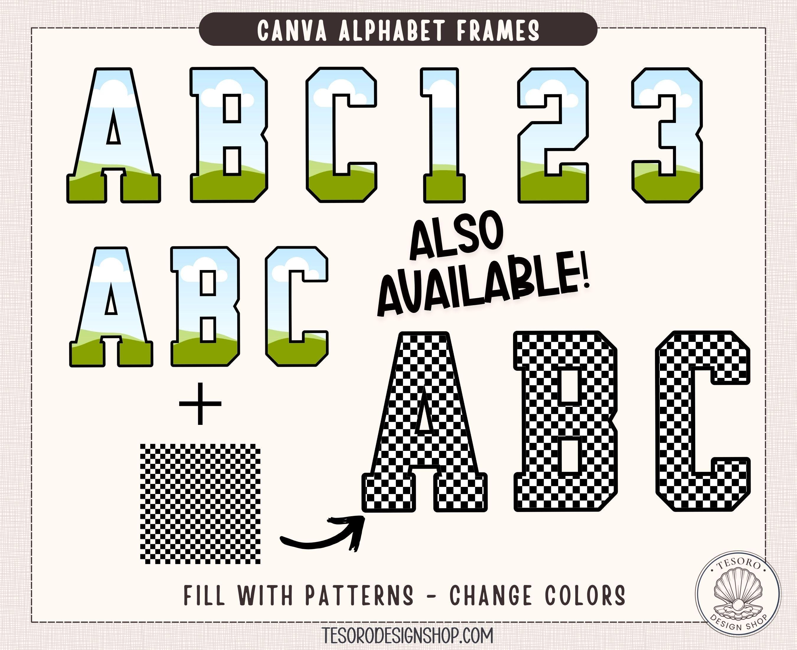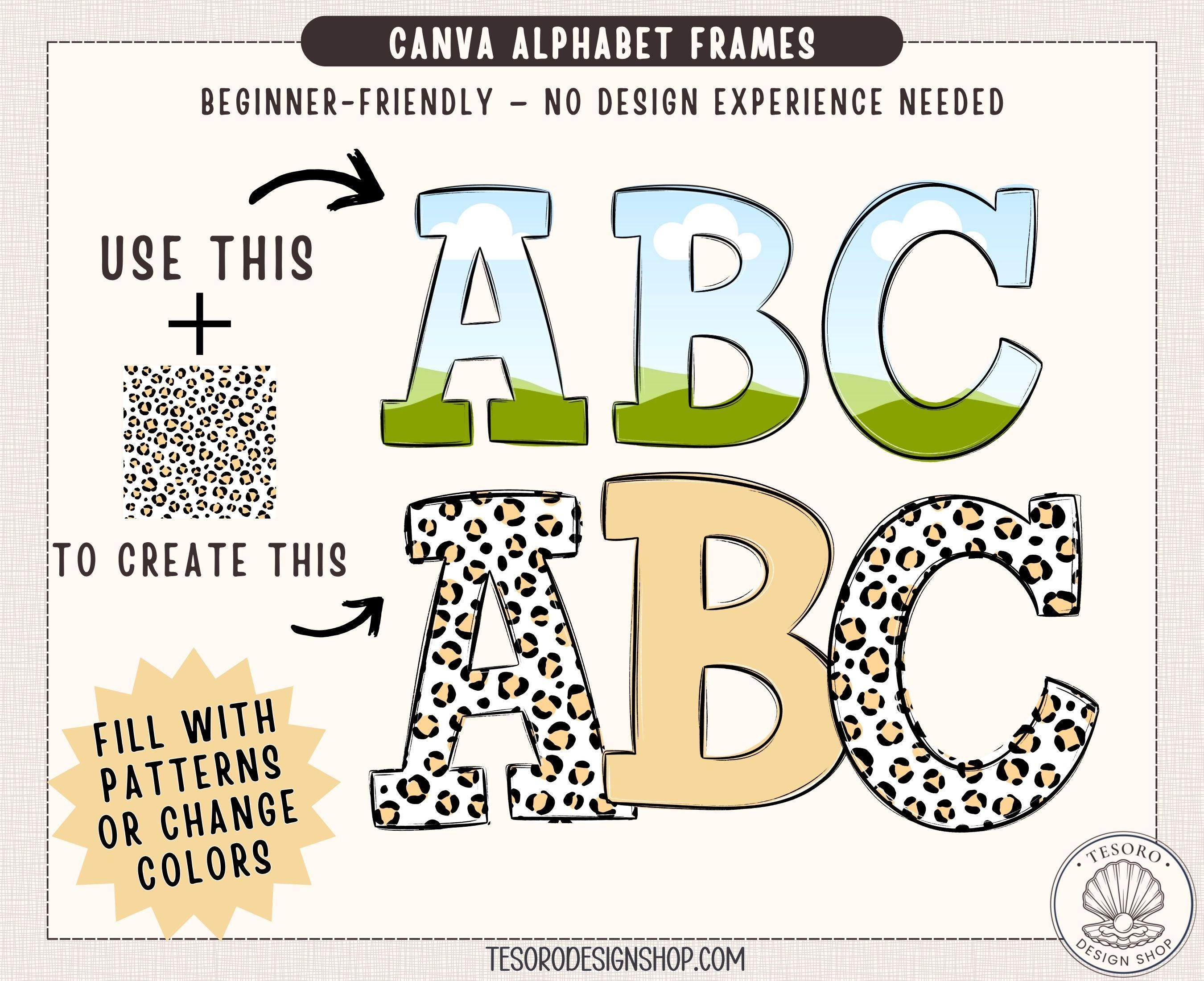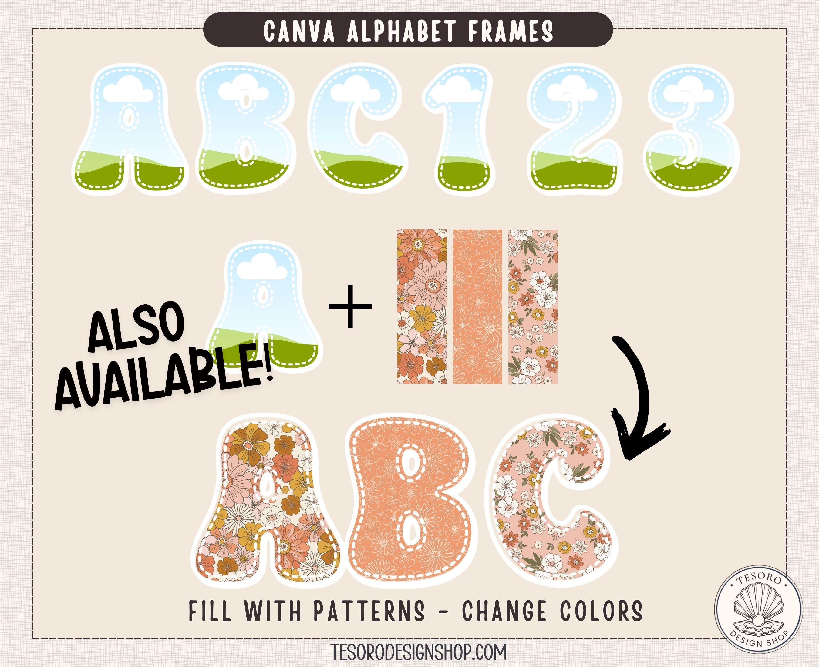 This listing includes a Canva template with fully editable alphabet frames that allow you to easily customize colors, patterns, and designs.